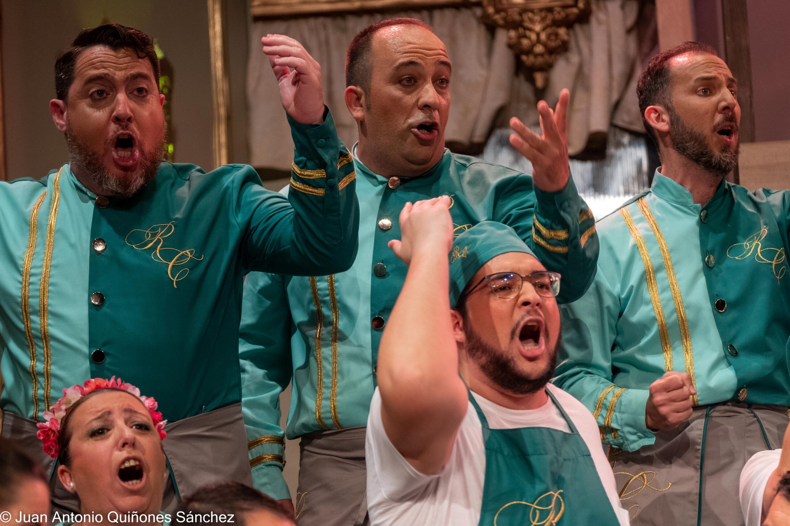 Chirigota de Benalup – Casas Viejas con letra de Alonso José Ortega Muñoz y José Andrés Ortega Silva, música de Jesús Cervera Vilches y dirección de Alonso José Ortega Muñoz. Aparecen en escena en esta ocasión de rodillas con los brazos en cruz y unos libros en las manos como castigaban en el colegio antiguamente.