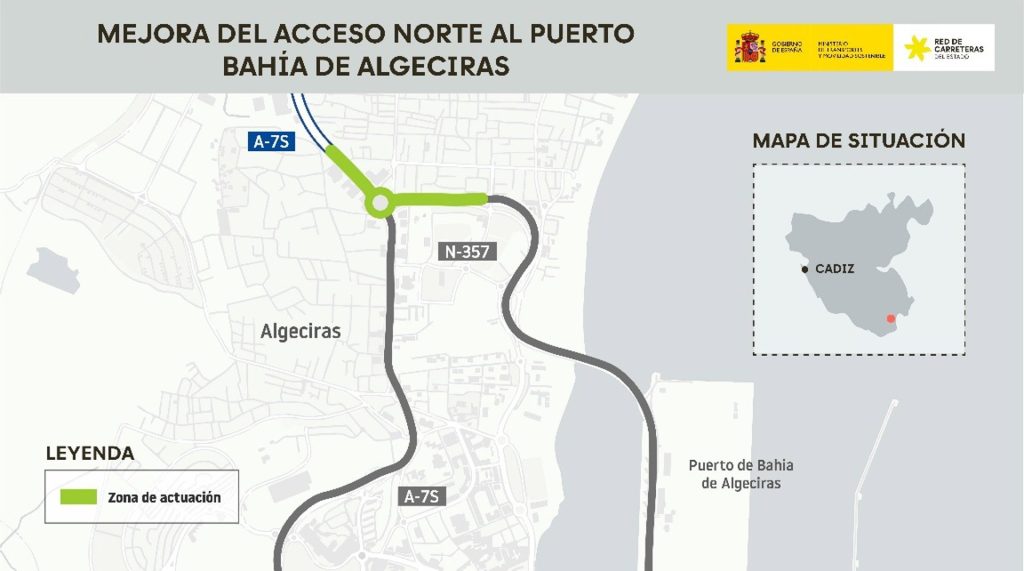 A licitación las obras de mejora del acceso norte al puerto de Algeciras por la A-7 en el marco de un conjunto de actuaciones destinadas a reforzar la red viaria de la provincia de Cádiz. Desde el Ministerio de Transportes y Movilidad Sostenible se ha señalado que, además de este proyecto, se continúa avanzando en las obras de mejora del acceso sur al puerto de Algeciras, con una inversión superior a los 50 millones de euros.