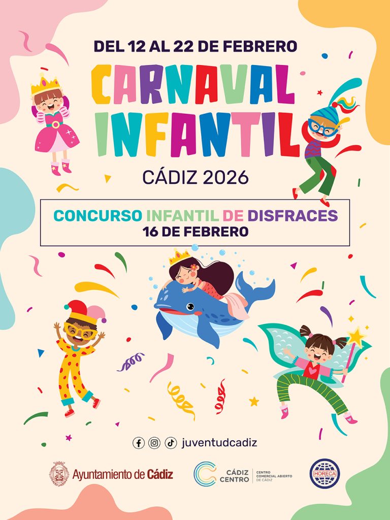 La Delegación Municipal de Juventud e Infancia ha abierto el plazo de inscripción para el concurso infantil de disfraces del Carnaval de Cádiz 2026. El certamen, integrado en la programación oficial del Carnaval, se celebrará el lunes 16 de febrero en la plaza de San Antonio en horario de 16:00 a 18:00 horas y contará con la colaboración de la Asociación Cádiz Centro Comercial Abierto.