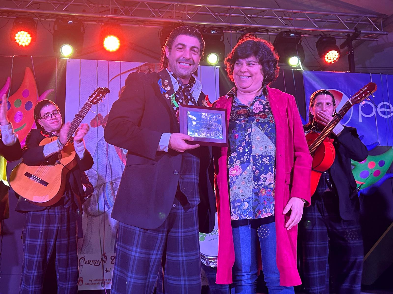 Durante el pregón, Antonio Álvarez combinó intervenciones humorísticas con coplas junto a su agrupación. En el escenario participaron también los sanluqueños Rafael Rodríguez ‘Pay’, Álvaro Ballén y Juan del Ojo, pregonero del pasado año. Al finalizar, la alcaldesa entregó al pregonero una placa de reconocimiento municipal.