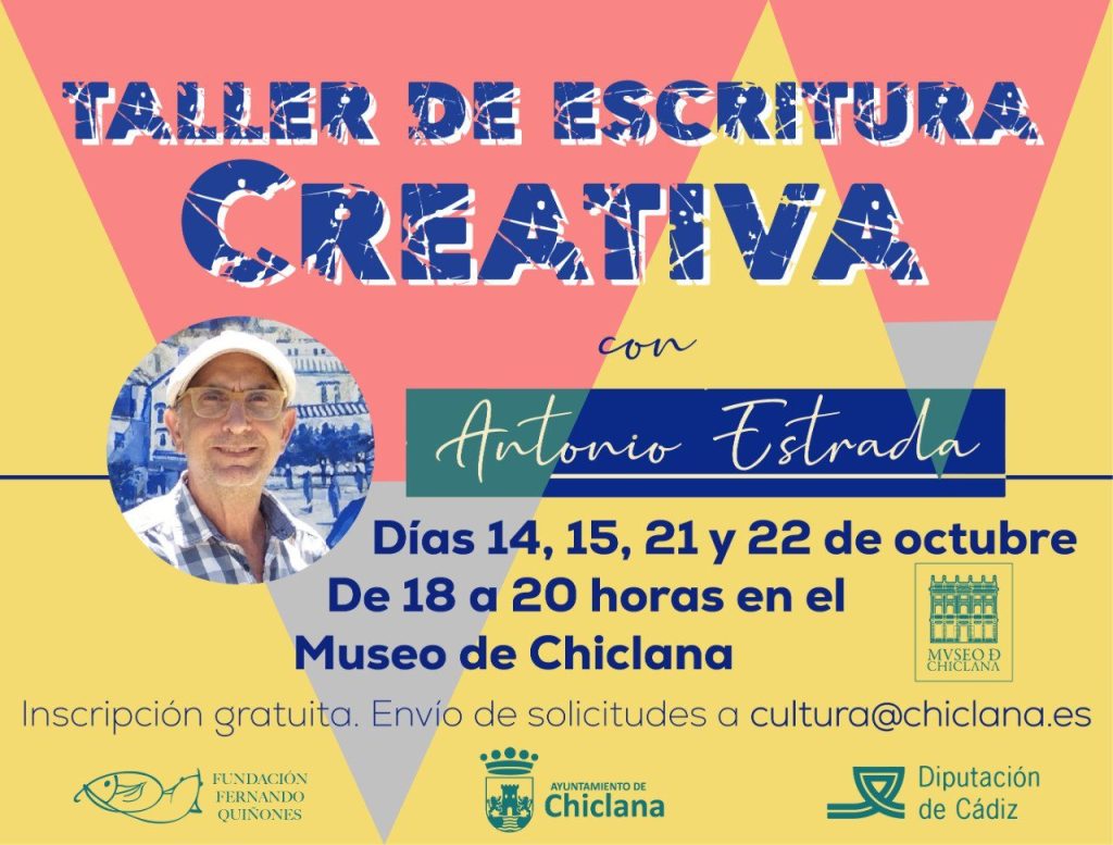 El escritor, actor y director escénico Antonio Estrada ofrecerá un taller de creación literaria en Chiclana durante el mes de octubre. La actividad, organizada por la Fundación Fernando Quiñones y patrocinada por la Diputación de Cádiz, se desarrollará en el salón de actos del Museo de Chiclana los días 14, 15, 21 y 22, en horario de 18 a 20 horas. La participación es gratuita, previa inscripción por correo electrónico en cultura@chiclana.es, hasta completar aforo.