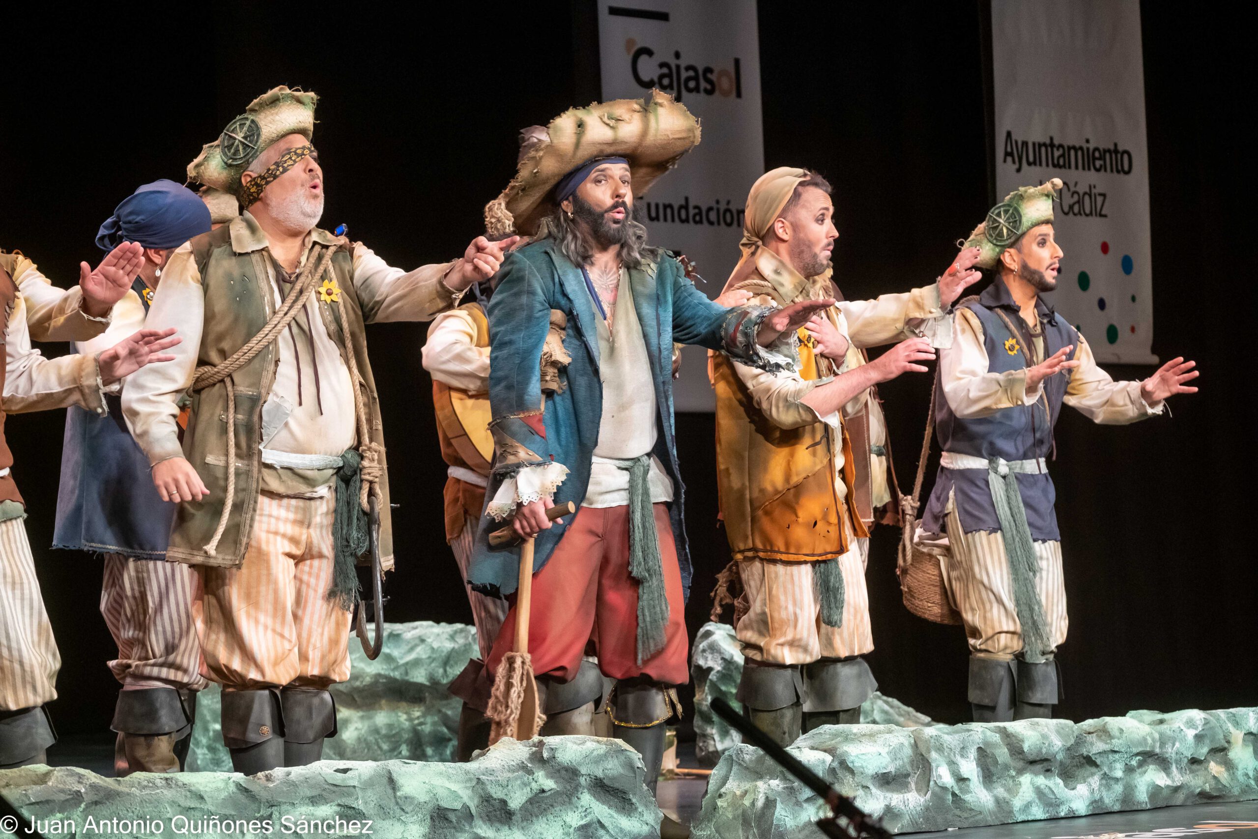 La comparsa Aquí me quito las penas, procedente de El Puerto de Santa María, presentó su propuesta en las preliminares del COAC 2025 con una temática marinera centrada en pescadores que buscan consuelo en el mar. Aunque la interpretación vocal fue sólida y la dirección de Ramón Herrera Vaca garantizó una afinación precisa, el repertorio no logró captar completamente la atención del público.