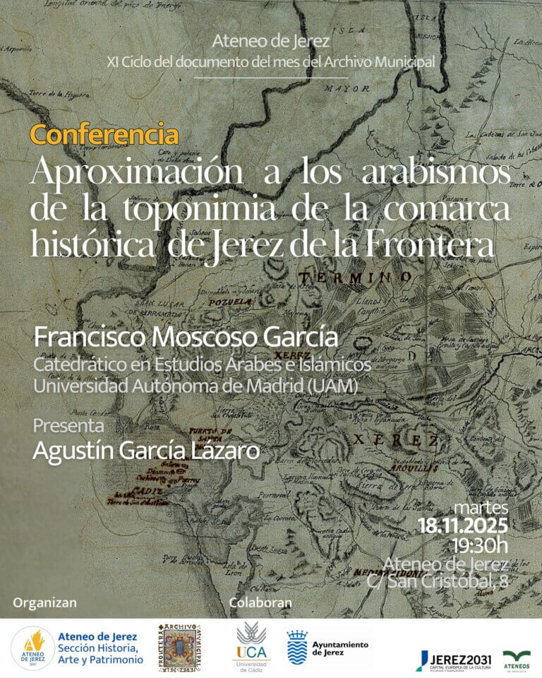 El Ateneo de Jerez celebrará el martes 18 de noviembre a las 19:30 horas la conferencia titulada “Aproximación a los arabismos de la toponimia de la comarca histórica de Jerez de la Frontera”, una cita que invita al público a descubrir la huella lingüística y cultural que el legado andalusí ha dejado en el territorio. La actividad, que tendrá lugar en la sede del Ateneo situada en la calle San Cristóbal, número 8, está abierta al público con entrada libre hasta completar aforo.