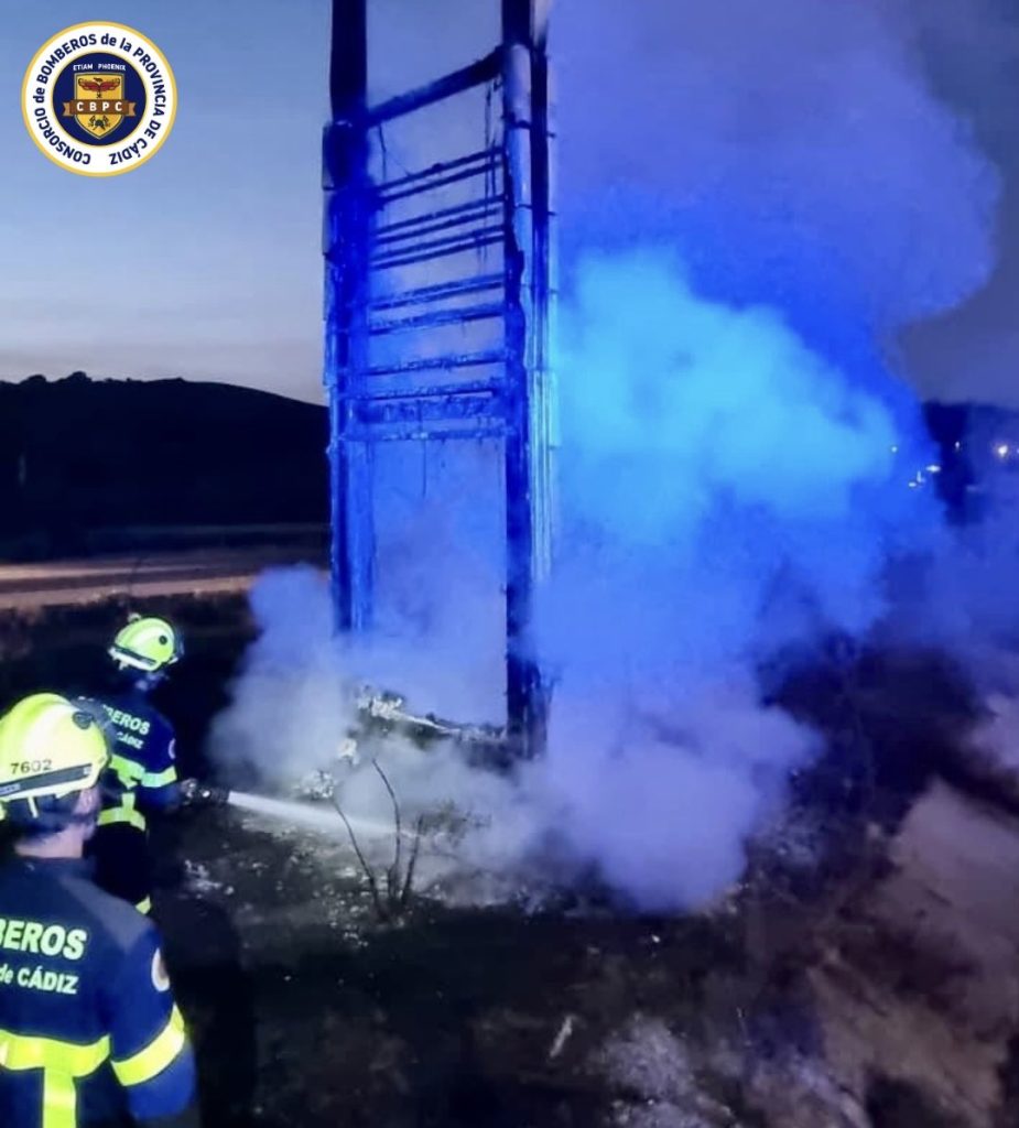 Hasta el lugar se desplazaron cuatro efectivos del Consorcio de Bomberos de la Provincia de Cádiz (CBPC), apoyados por los vehículos P-31 y R-28. A su llegada, los bomberos encontraron el monolito ardiendo en su totalidad, con riesgo de propagación debido a la cercanía de vegetación seca situada en el perímetro de la estación de servicio.