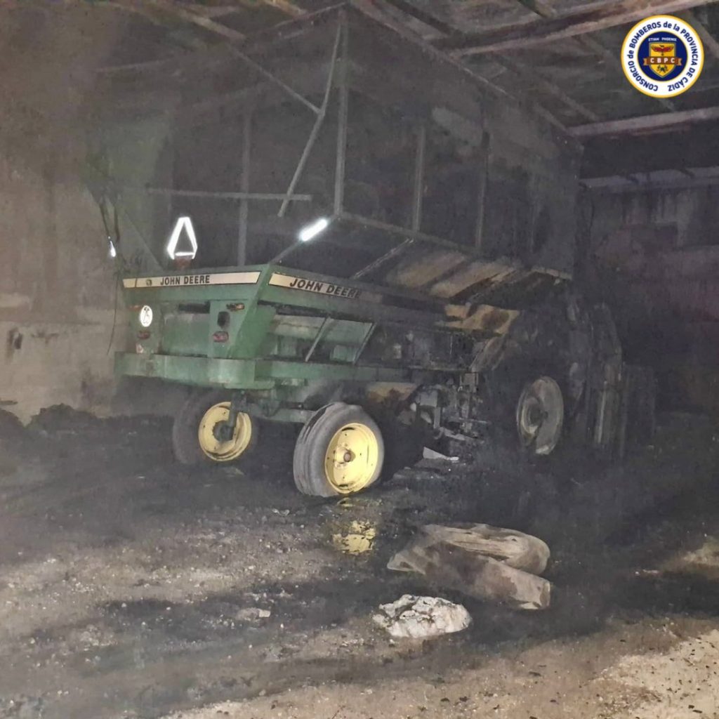 El fuego, que afectó a una cosechadora y residuos en el interior de la nave, fue controlado por nueve efectivos del Consorcio de Bomberos de Cádiz