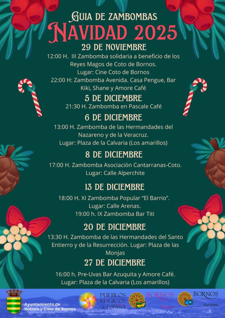 La primera jornada será el 29 de noviembre con dos propuestas: una zambomba solidaria en beneficio de los Reyes Magos de Coto de Bornos en el Cine Coto de Bornos a mediodía y, ya por la noche, la Zambomba Avenida organizada por Casa Pengue, Bar Kiki, Shane y Amore Café. El calendario continuará el 5 de diciembre con una zambomba en Pascale Café y el 6 de diciembre con una de las más populares del municipio, la Zambomba de las Hermandades del Nazareno y de la Veracruz en la Plaza de la Calvaria.