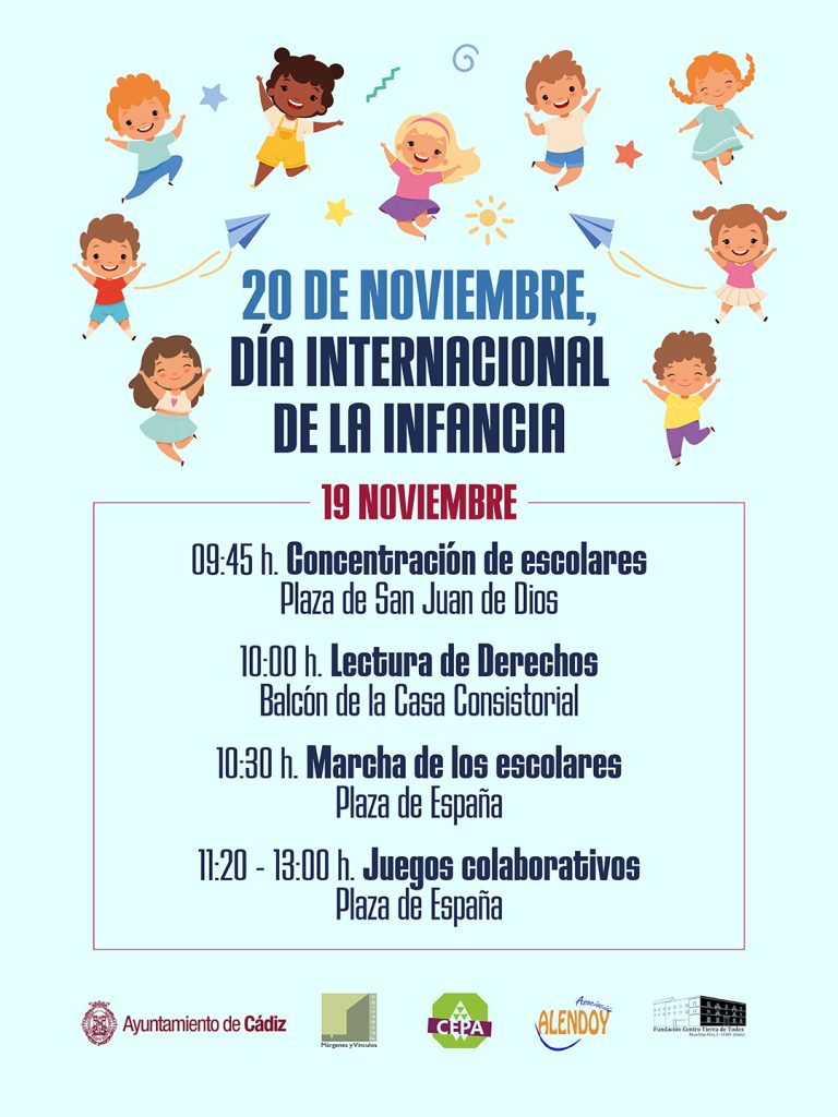 Cádiz celebrará este miércoles 19 de noviembre el Día Internacional de la Infancia con una jornada organizada por la Delegación Municipal de Juventud e Infancia junto a las entidades Márgenes y Vínculos, Alendoy, Cepa y Tierra de Todos. El objetivo es sensibilizar sobre los derechos de niñas y niños y reforzar el compromiso municipal con una ciudad más concienciada, solidaria y respetuosa con la infancia.
