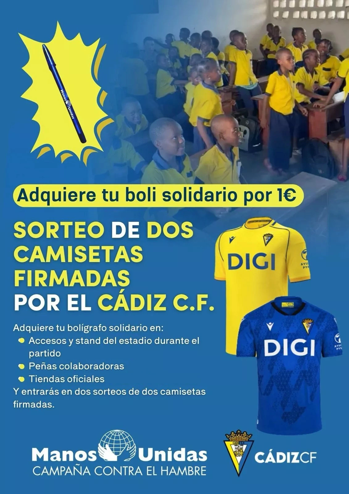 La campaña solidaria Cádiz CF Manos Unidas se desarrollará el 12 de abril en el estadio Nuevo Mirandilla con la venta de bolígrafos a un euro para financiar proyectos contra el hambre en países en desarrollo.