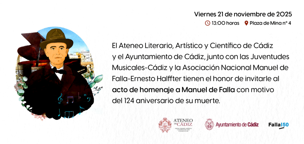 El Ayuntamiento de Cádiz ha organizado un programa de actividades para conmemorar el 149º aniversario del nacimiento del compositor gaditano Manuel de Falla, considerado una de las figuras más influyentes de la música española del siglo XX. La iniciativa se desarrollará en distintos días y escenarios, con la Plaza de Mina —frente a su casa natal— como punto central del homenaje, y reunirá a instituciones, conservatorios y agrupaciones musicales de la ciudad. El homenaje a Manuel de Falla en la Plaza de Mina pone en valor la vida y obra del compositor gaditano y busca acercar su legado a la ciudadanía.