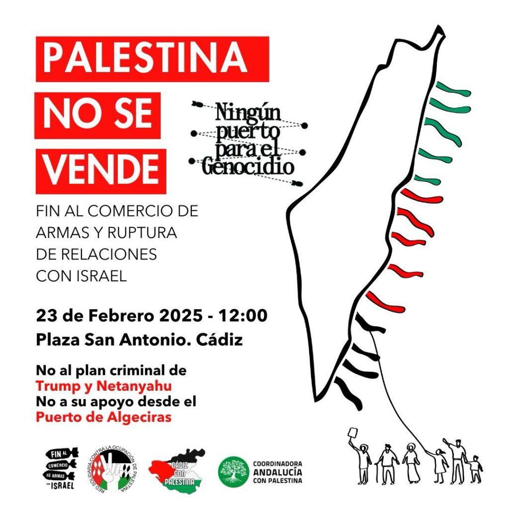 La plataforma ciudadana Cádiz por Palestina ha convocado una manifestación este domingo, 23 de febrero, a las 12 horas desde la plaza San Antonio, para unirse a las numerosas movilizaciones que se celebrarán en todo el estado en rechazo a la ocupación de Palestina y al plan criminal promovido por el presidente de Estados Unidos, Donald Trump, y el primer ministro de Israel, Benjamin Netanyahu. Esta será la segunda manifestación de 2025, continuando con las denuncias sobre la ocupación sionista y los presuntos planes de limpieza étnica en la región.