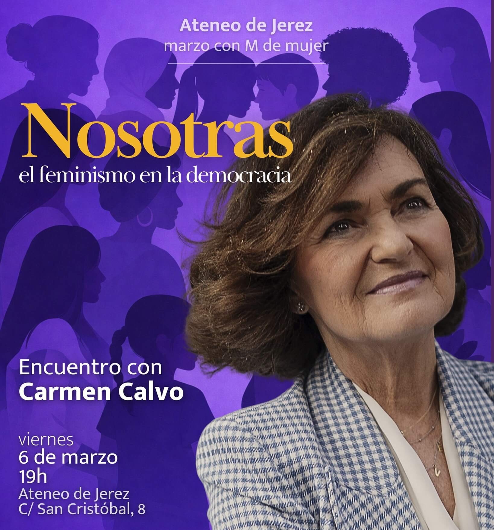 Carmen Calvo en el Ateneo de Jerez participará este viernes 6 de marzo en un encuentro abierto al público para abordar las propuestas de su libro “Nosotras. El feminismo en la democracia”, dentro del ciclo “Marzo con M de Mujer”.