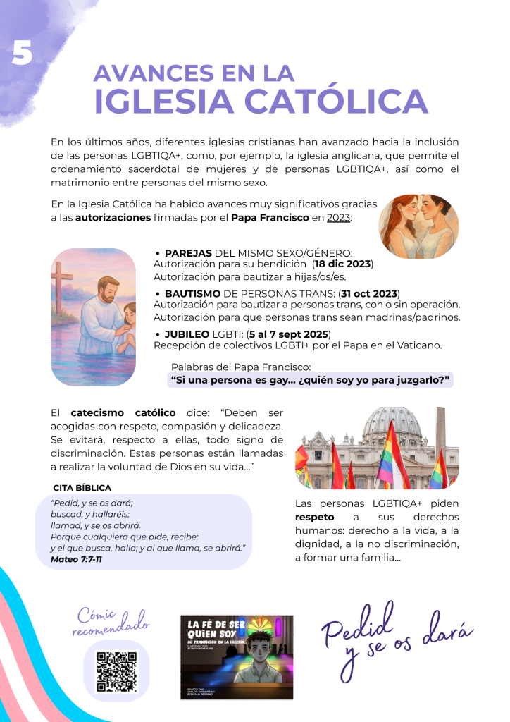 Junto a la exposición, los colectivos presentan el cómic juvenil “La Fe de ser quien soy”, recomendado a partir de los nueve años. La obra narra la historia de Andrés, un chico trans que busca su lugar en la escuela y en la Iglesia, acompañado por su amiga Miriam. El relato aborda la identidad trans en la adolescencia, la convivencia entre fe y diversidad y la importancia del acompañamiento comunitario, con un enfoque accesible para jóvenes, familias y educadores.