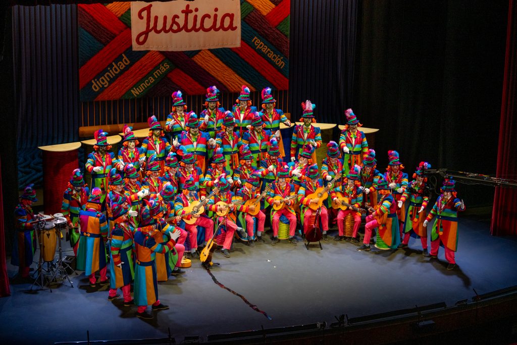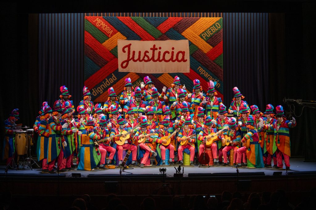 El popurrí mantuvo un tono crítico pero desdibujado. El coro intentó trazar una reflexión social sobre el “lío” contemporáneo, mezclando referencias al taller de costura, a las heridas sociales que hay que remendar o al hambre que empuja a probar la vida “cruda”. La intención era notable, pero el desarrollo careció de conducción interna y terminó fragmentado. La percusión añadida aportó colorido, pero la interpretación siguió siendo débil, con escaso empaste y textualidad poco comprensible para el oyente medio.