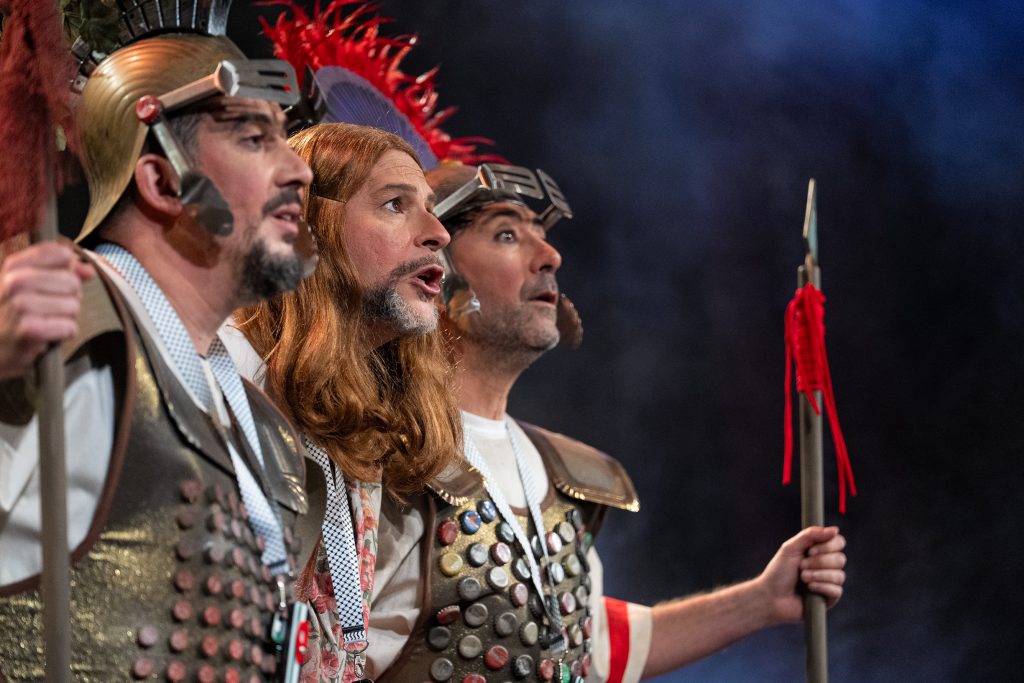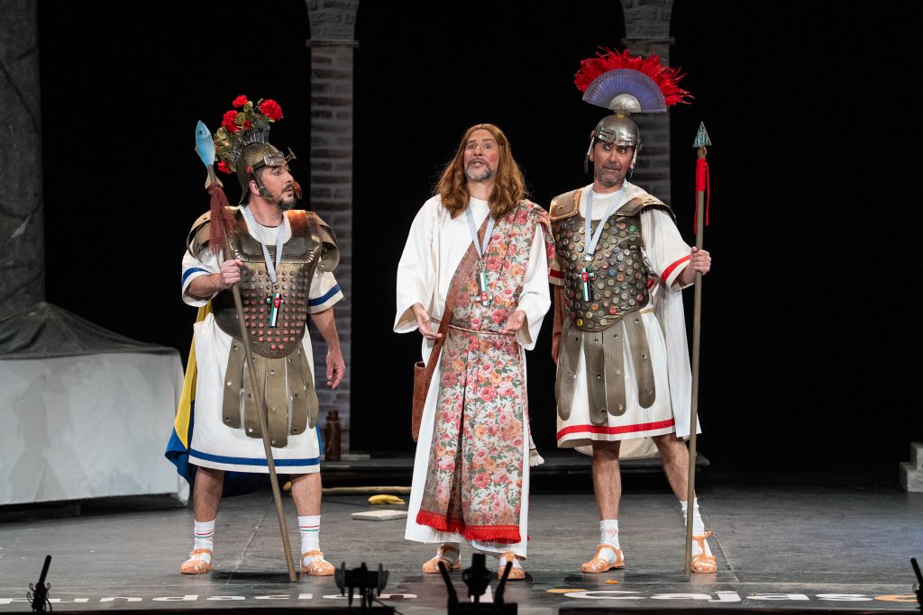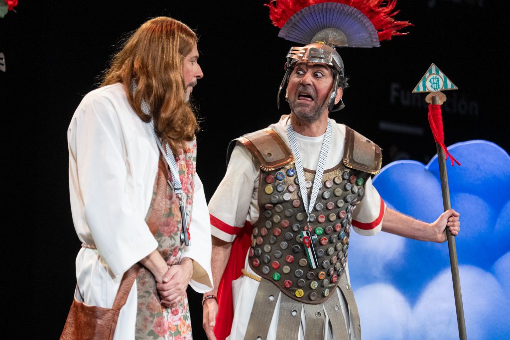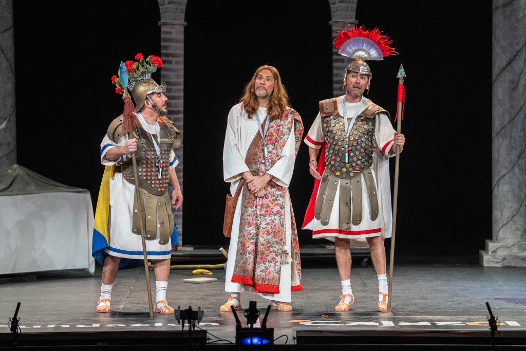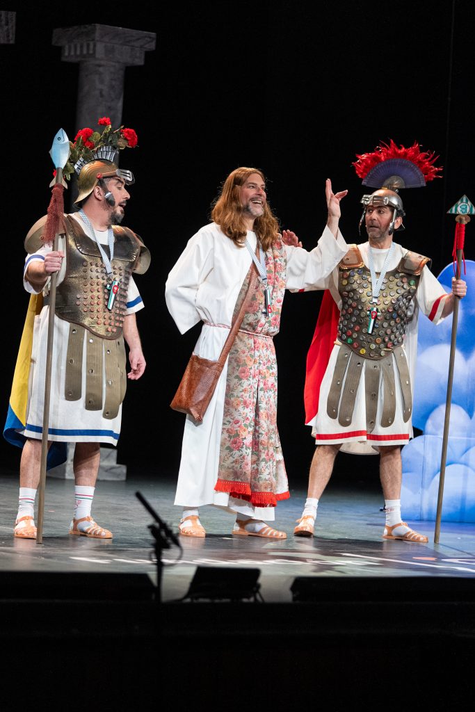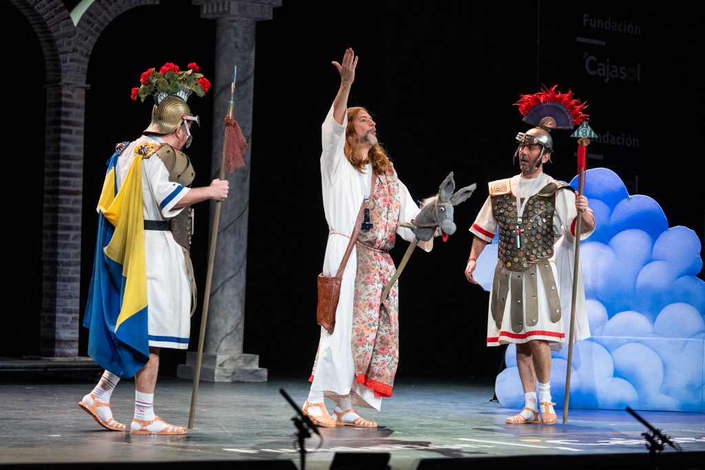 El planteamiento inicial situó la acción en Jerusalén, convertida en escenario carnavalero donde romanos y personajes bíblicos hablan, discuten y actúan con acento gaditano. El recurso funcionó por su claridad dramatúrgica: el verso no fue un ornamento sino la herramienta central del humor. La trama avanzó mediante interrogatorios, controles burocráticos y situaciones reconocibles, como la identificación de Jesús a través de “papeles”, la administración romana convertida en oficina y el acceso a la ciudad como si fuese frontera urbana.