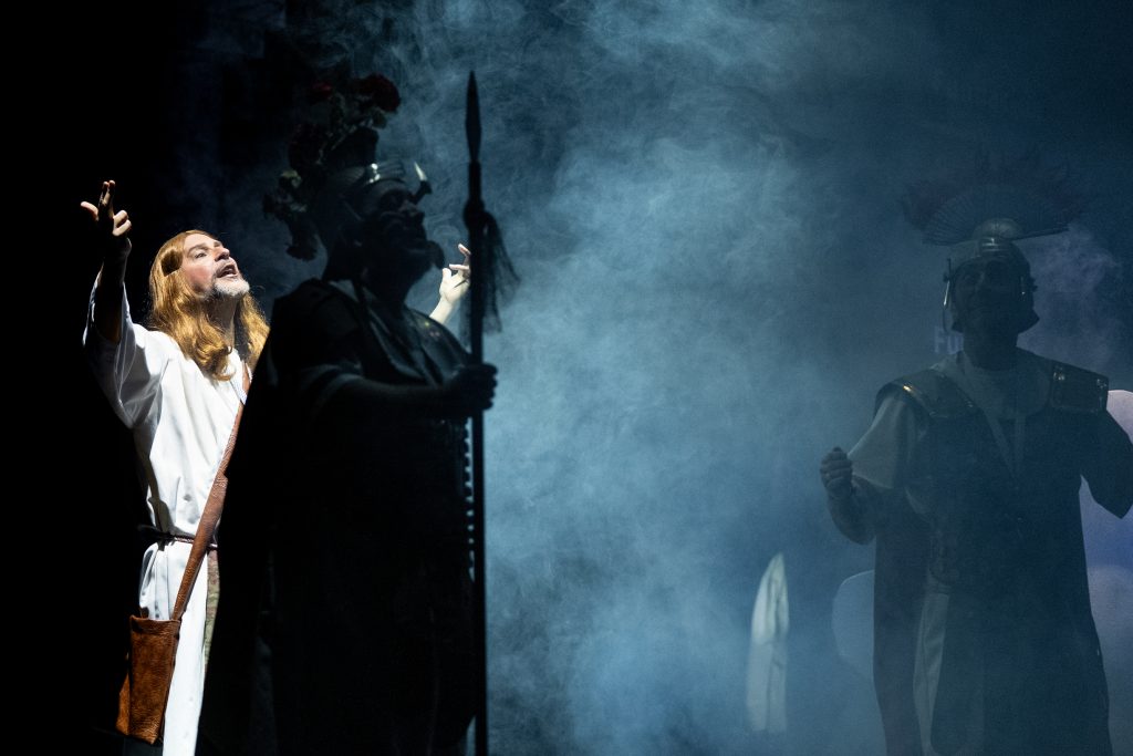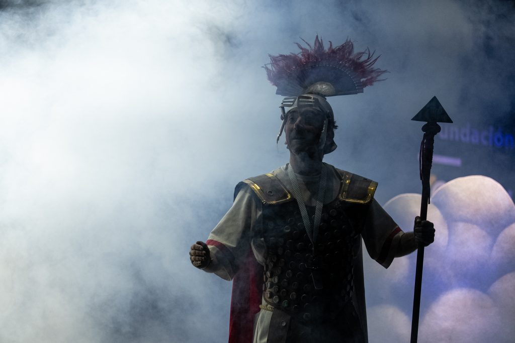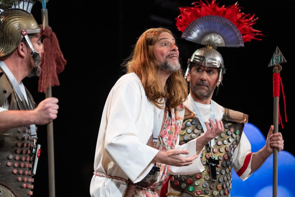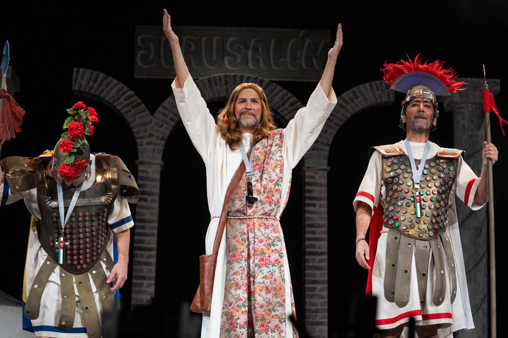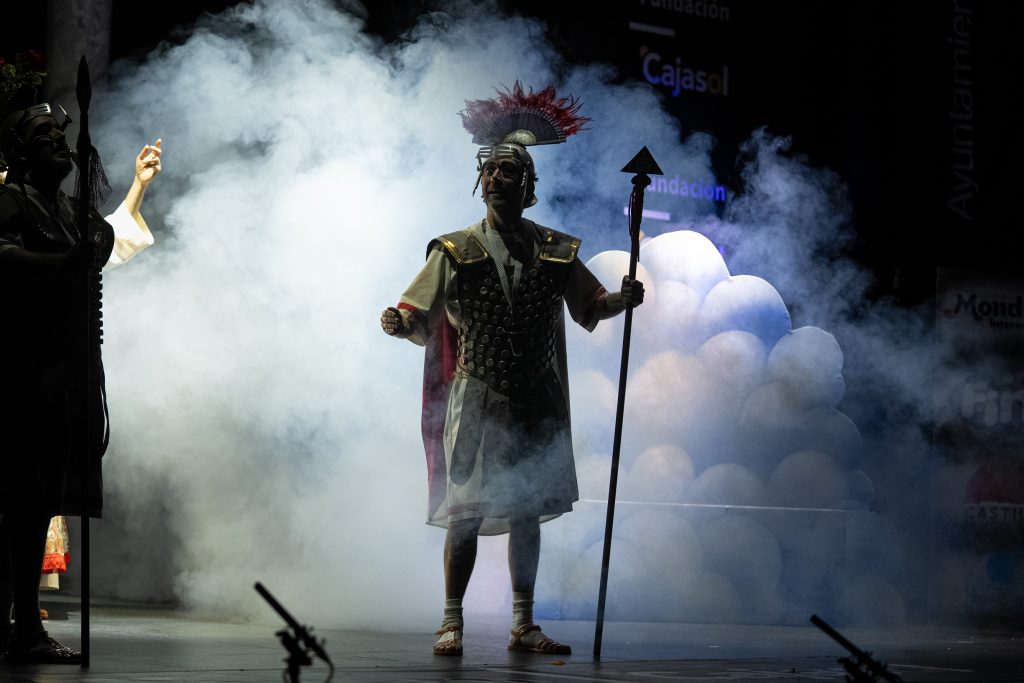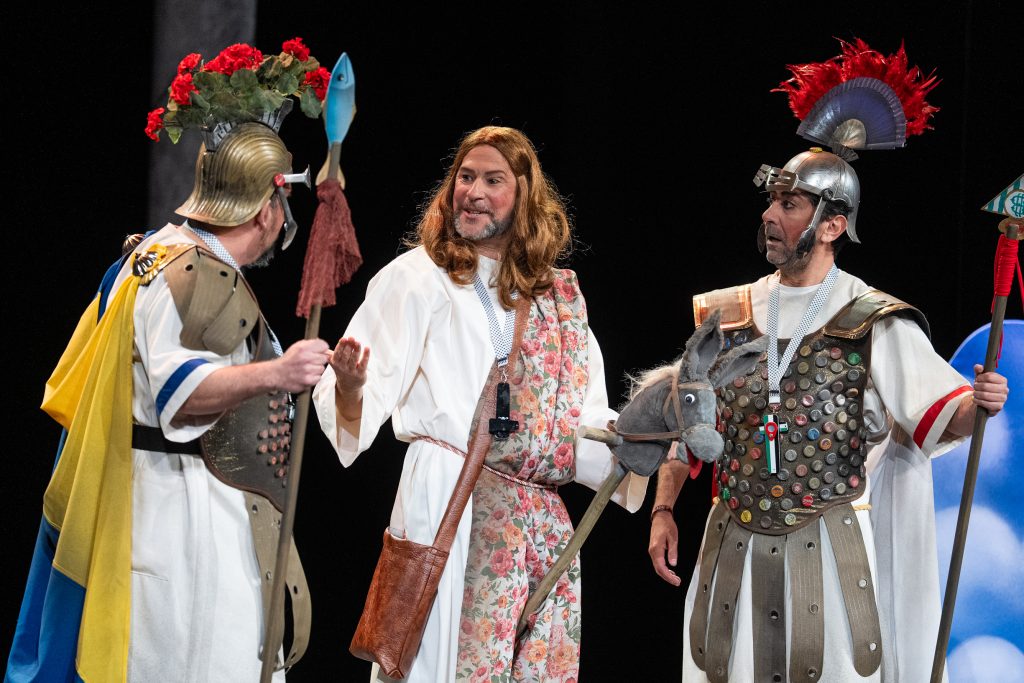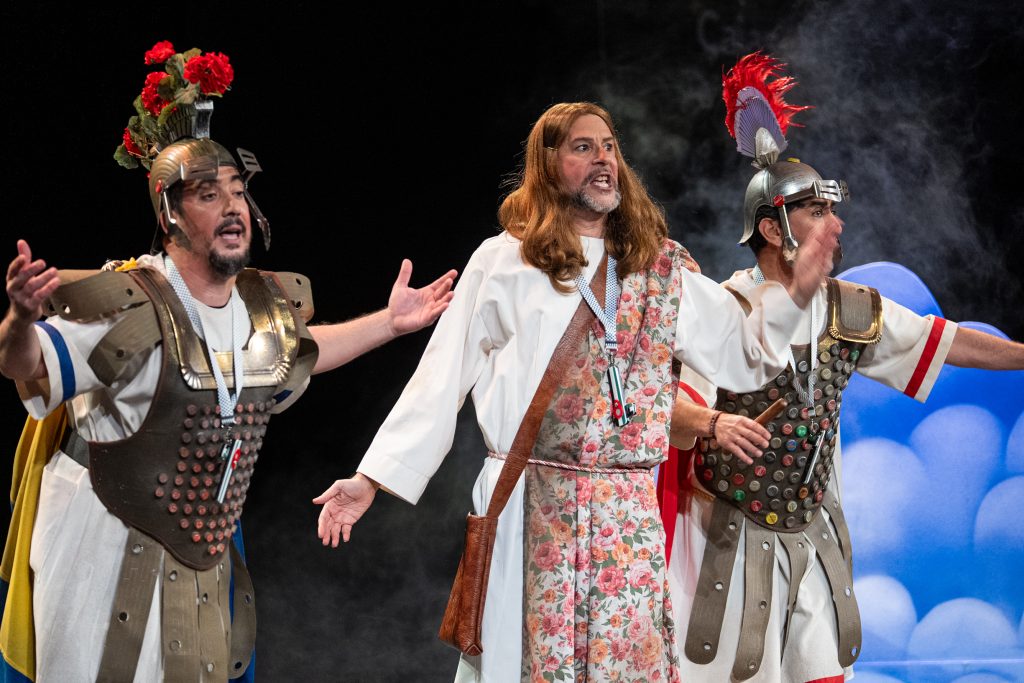 El planteamiento inicial situó la acción en Jerusalén, convertida en escenario carnavalero donde romanos y personajes bíblicos hablan, discuten y actúan con acento gaditano. El recurso funcionó por su claridad dramatúrgica: el verso no fue un ornamento sino la herramienta central del humor. La trama avanzó mediante interrogatorios, controles burocráticos y situaciones reconocibles, como la identificación de Jesús a través de “papeles”, la administración romana convertida en oficina y el acceso a la ciudad como si fuese frontera urbana.