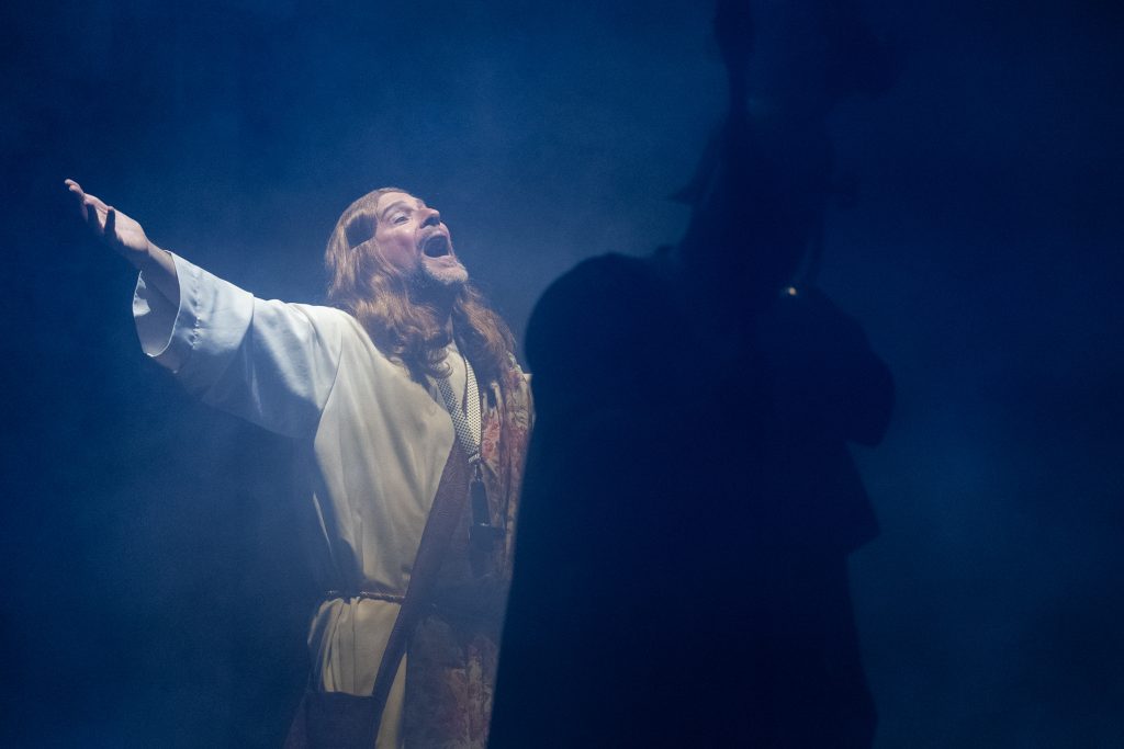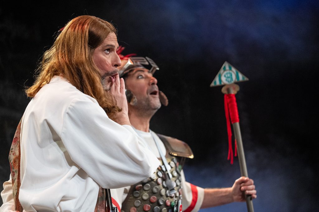 La parte final alcanzó su mejor tramo cuando la Santa Cena se transformó en una especie de romería de tapas, con nombres bíblicos reinterpretados como platos, productos y referencias gastronómicas locales. La cena terminó con un cierre metateatral que conectó la pasión bíblica con la pasión gaditana, haciendo confluir costumbre, religión y Carnaval en una misma escena.