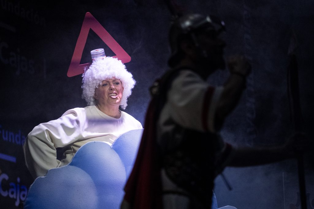 El desarrollo narrativo creció cuando aparecieron nuevos personajes, especialmente una figura divina no binaria, y cuando la acción avanzó hacia la Santa Cena, que la agrupación convirtió en cena de bar, con cervecitas, problemas laborales, convenios precarios y referencias al sector hostelero. La lectura del texto fue constante y estuvo sostenida por la rima, la réplica y el ritmo interno, lo que permitió mantener el interés del público sin recurrir al grito ni al gag repetitivo.