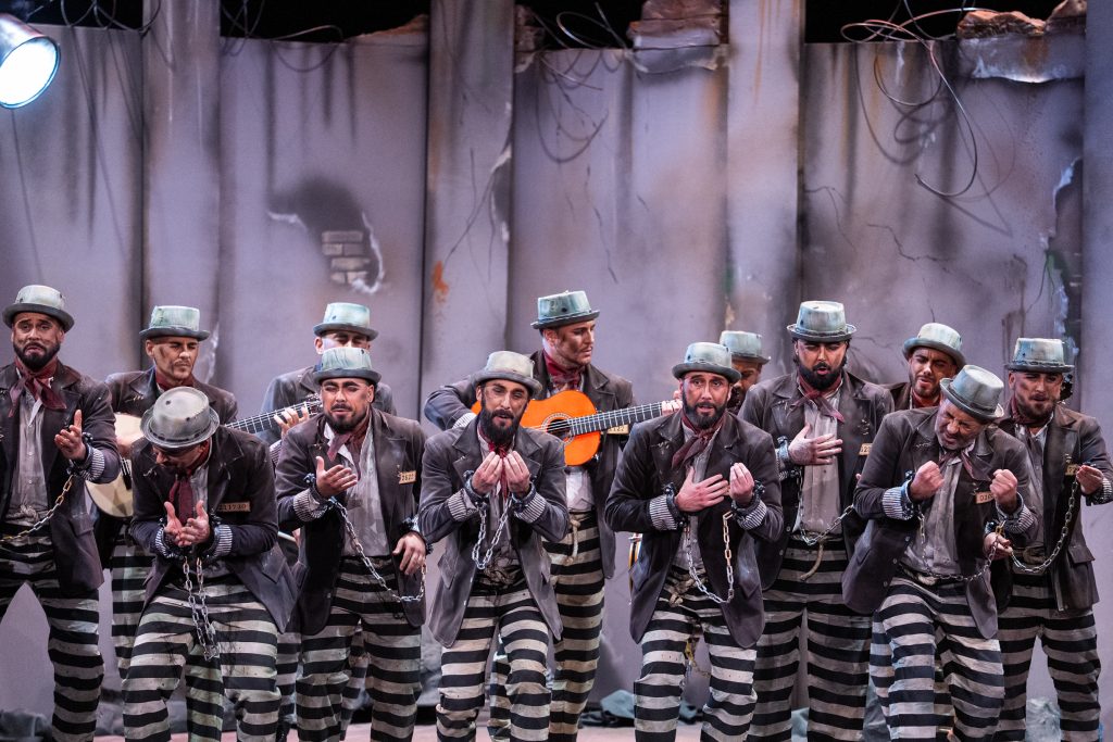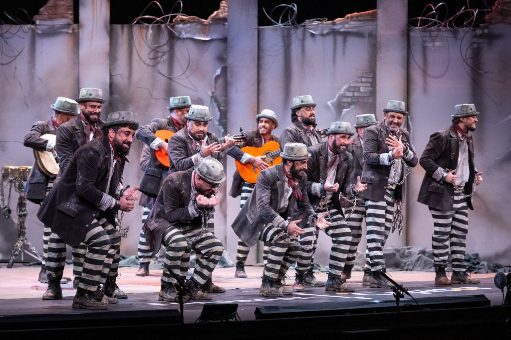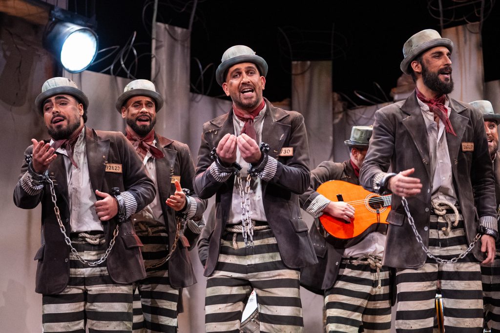 La presentación anunció la clave del repertorio: el personaje se declara culpable no por delito alguno, sino por querer cantar “siendo de fuera”. La escenografía penitenciaria, las rejas y el tono confesional instalaron al espectador en un marco de cárcel emocional más que física. Una de las virtudes del pase fue precisamente sostener ese código durante todo el repertorio, evitando la disgregación temática habitual cuando el tipo parte de una metáfora amplia.