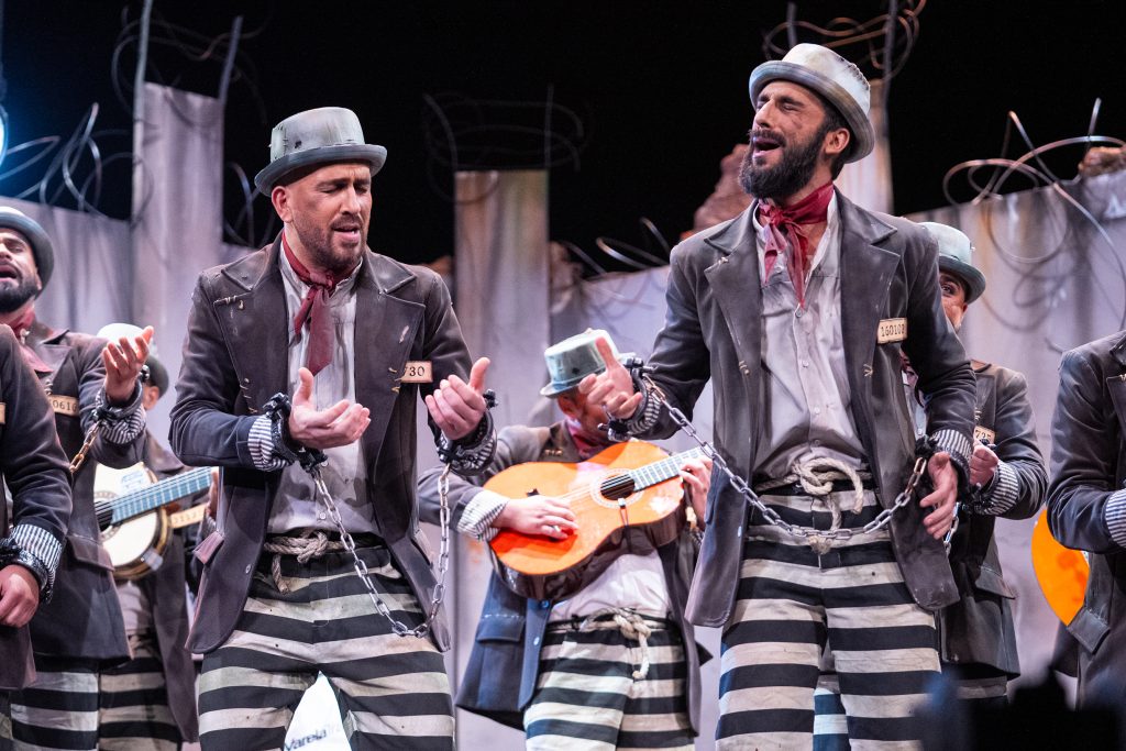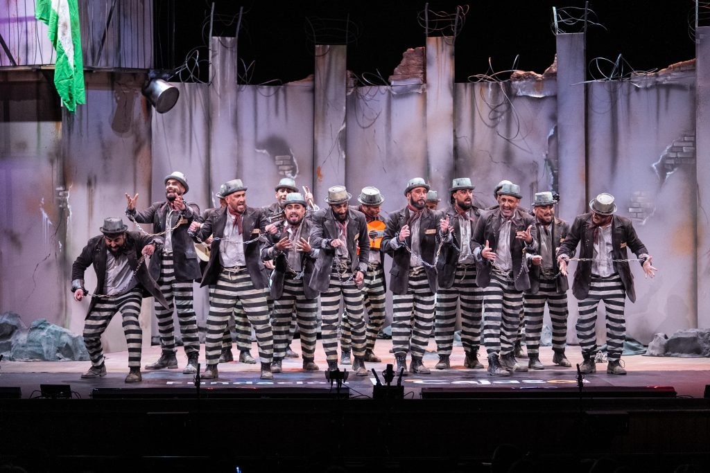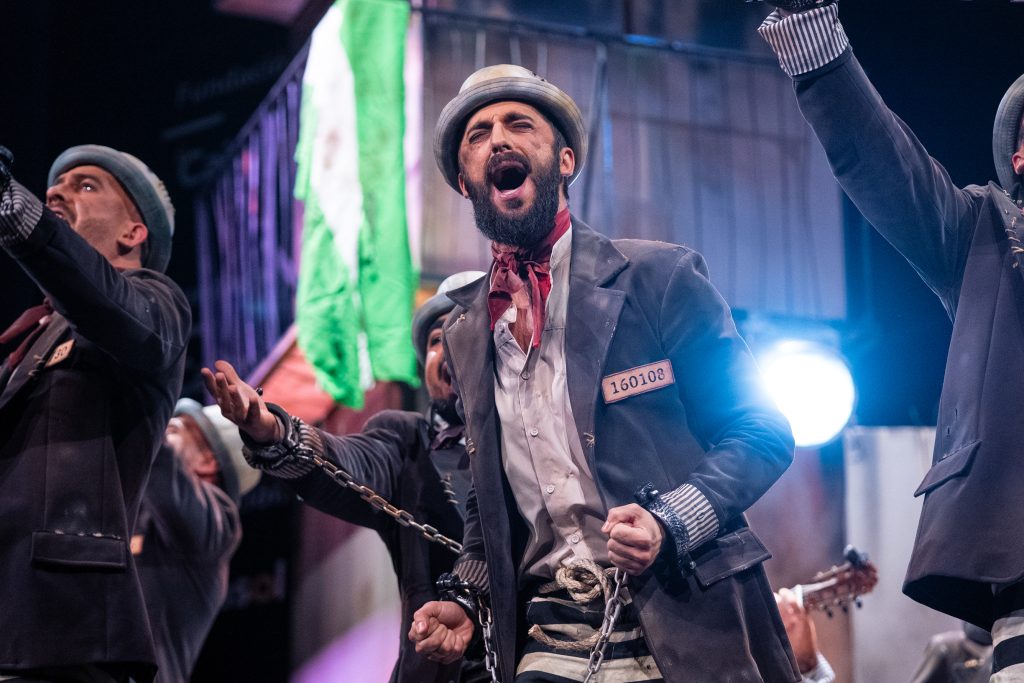 El popurrí sostuvo el nivel del repertorio y fue el tramo mejor resuelto. La narración reposició el conflicto entre deseo y condena: el preso que sueña con libertad, el padre que lamenta el tiempo no entregado, el reo que imagina volver a pisar las calles y recuperar la identidad perdida. La dramaturgia se mantuvo sin ruptura y permitió que el personaje creciera hacia un cierre emocional: la libertad regresa en forma de reconciliación con la fiesta y con la propia culpa. El tramo final explicitó el metacarnaval: culpable por nombrar Cádiz, culpable por amarla y culpable por no renunciar al deseo de pertenecer.