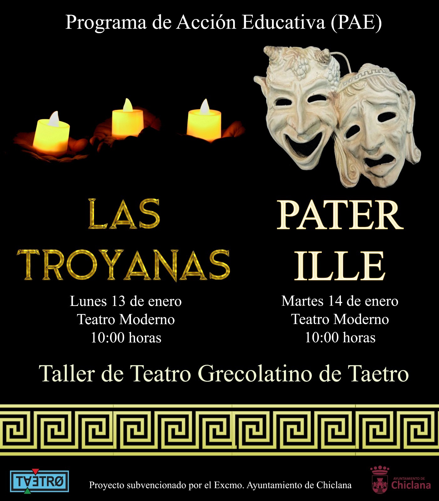 El Taller de Teatro Grecolatino es un proyecto educativo de Taetro que tiene vida más allá de su estreno anual en el Teatro Moderno. Son ya casi 15 ediciones en las que el resultado final del trabajo de los más jóvenes de la asociación tiene continuación con sesiones en diversos centros educativos de la provincia como complemento a asignaturas como Historia, Lengua y Literatura, Cultura Clásica, Latín o Griego. Además, el Grecolatino de Taetro cuenta con la colaboración de la Delegación Municipal de Cultura, en virtud del convenio de colaboración que sostiene con Taetro.