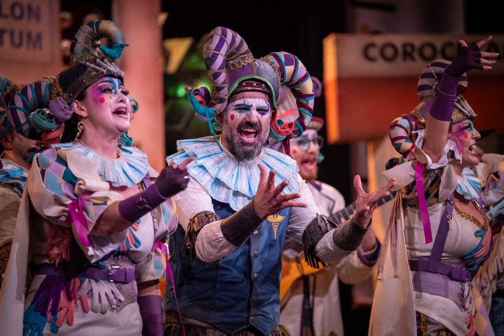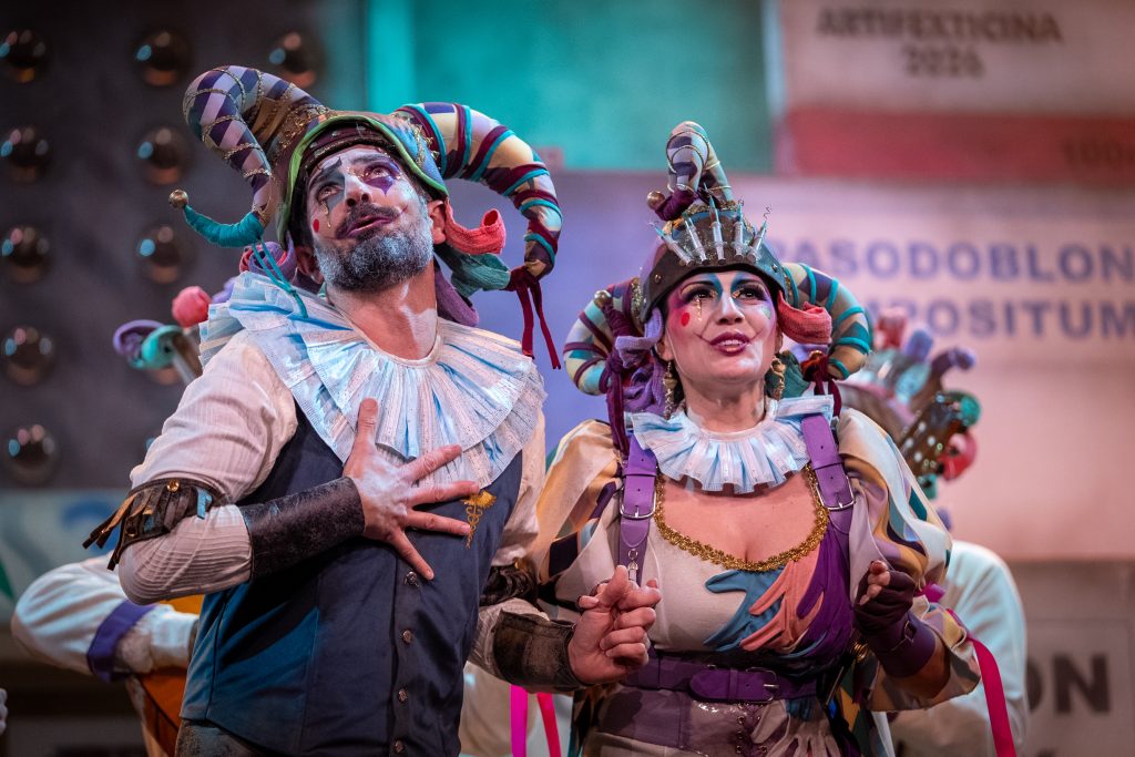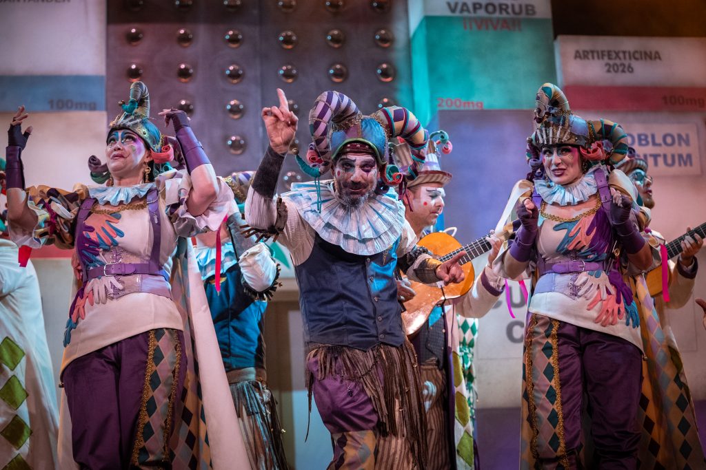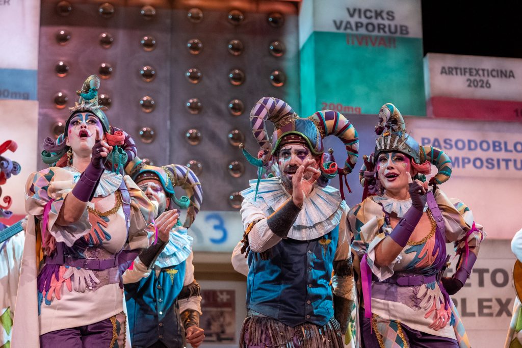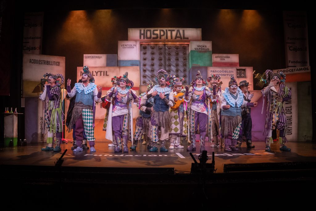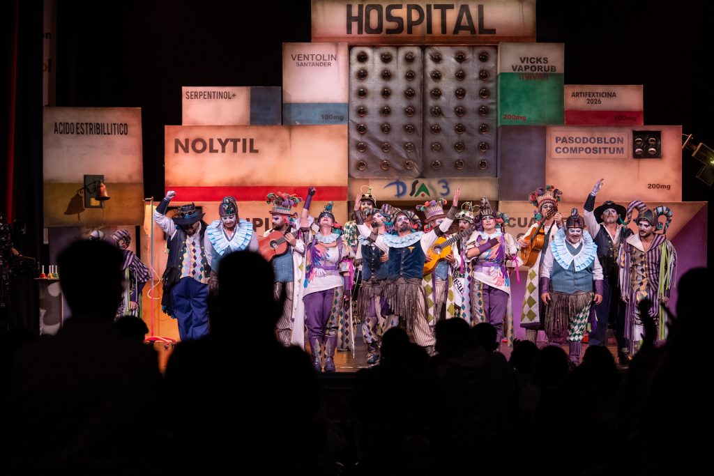 Desde la presentación, la comparsa dejó claro el marco simbólico en el que se mueve su repertorio. Los bufones que ocupan el escenario representan al personal sanitario y a quienes sostienen el sistema público de salud, figuras incómodas que dicen la verdad desde la ironía y el sarcasmo. La escenografía, cargada de signos reconocibles como la cruz verde de farmacia caída, refuerza la idea de un sistema degradado, convertido en mercancía y sometido a intereses políticos y económicos. La introducción es larga y exigente, pero perfectamente alineada con la intención del repertorio: incomodar, señalar y denunciar.