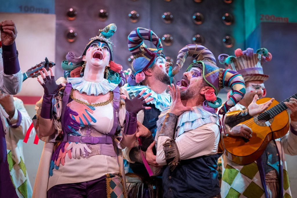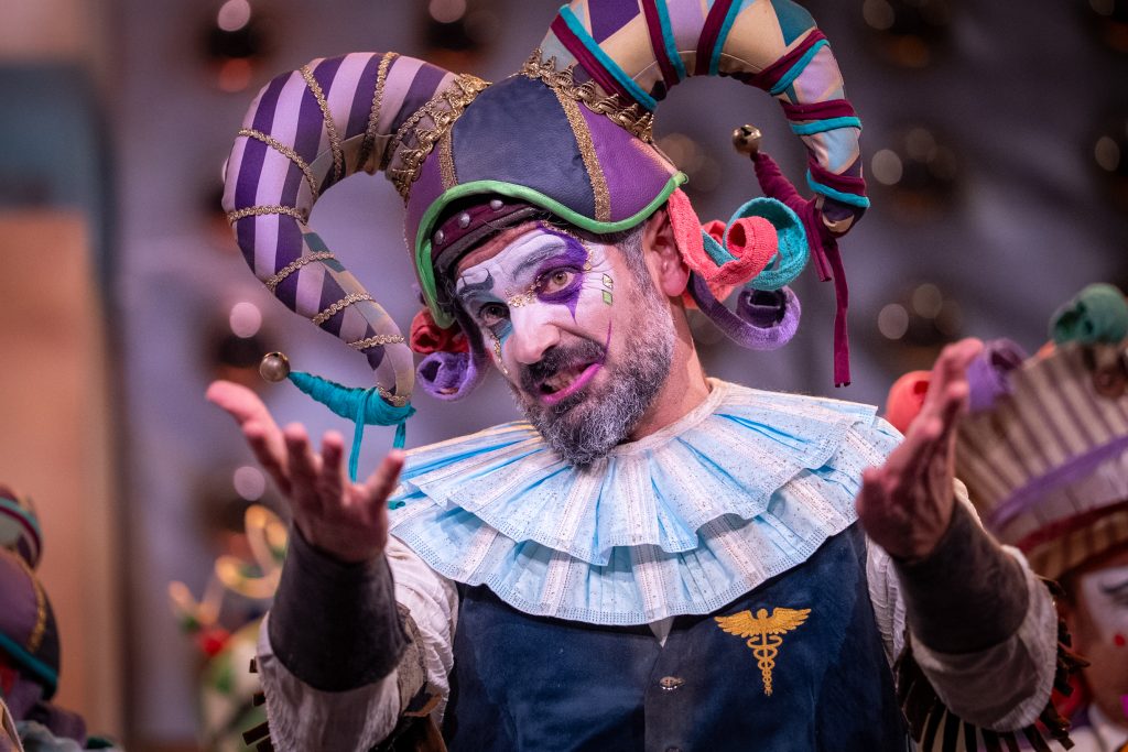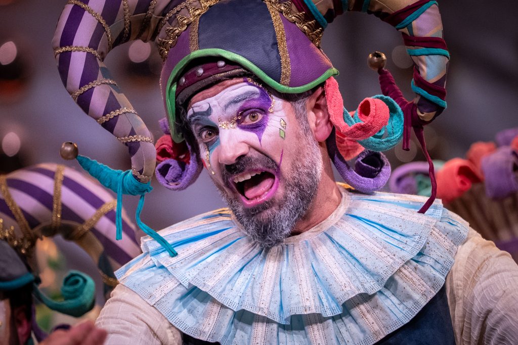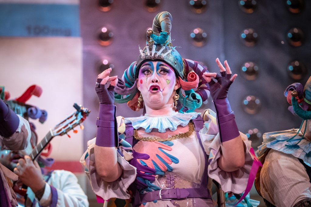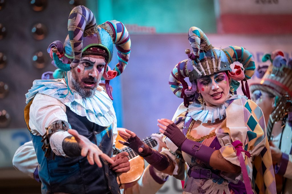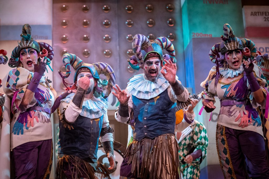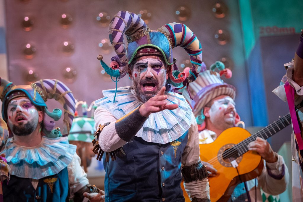Desde la presentación, la comparsa dejó claro el marco simbólico en el que se mueve su repertorio. Los bufones que ocupan el escenario representan al personal sanitario y a quienes sostienen el sistema público de salud, figuras incómodas que dicen la verdad desde la ironía y el sarcasmo. La escenografía, cargada de signos reconocibles como la cruz verde de farmacia caída, refuerza la idea de un sistema degradado, convertido en mercancía y sometido a intereses políticos y económicos. La introducción es larga y exigente, pero perfectamente alineada con la intención del repertorio: incomodar, señalar y denunciar.