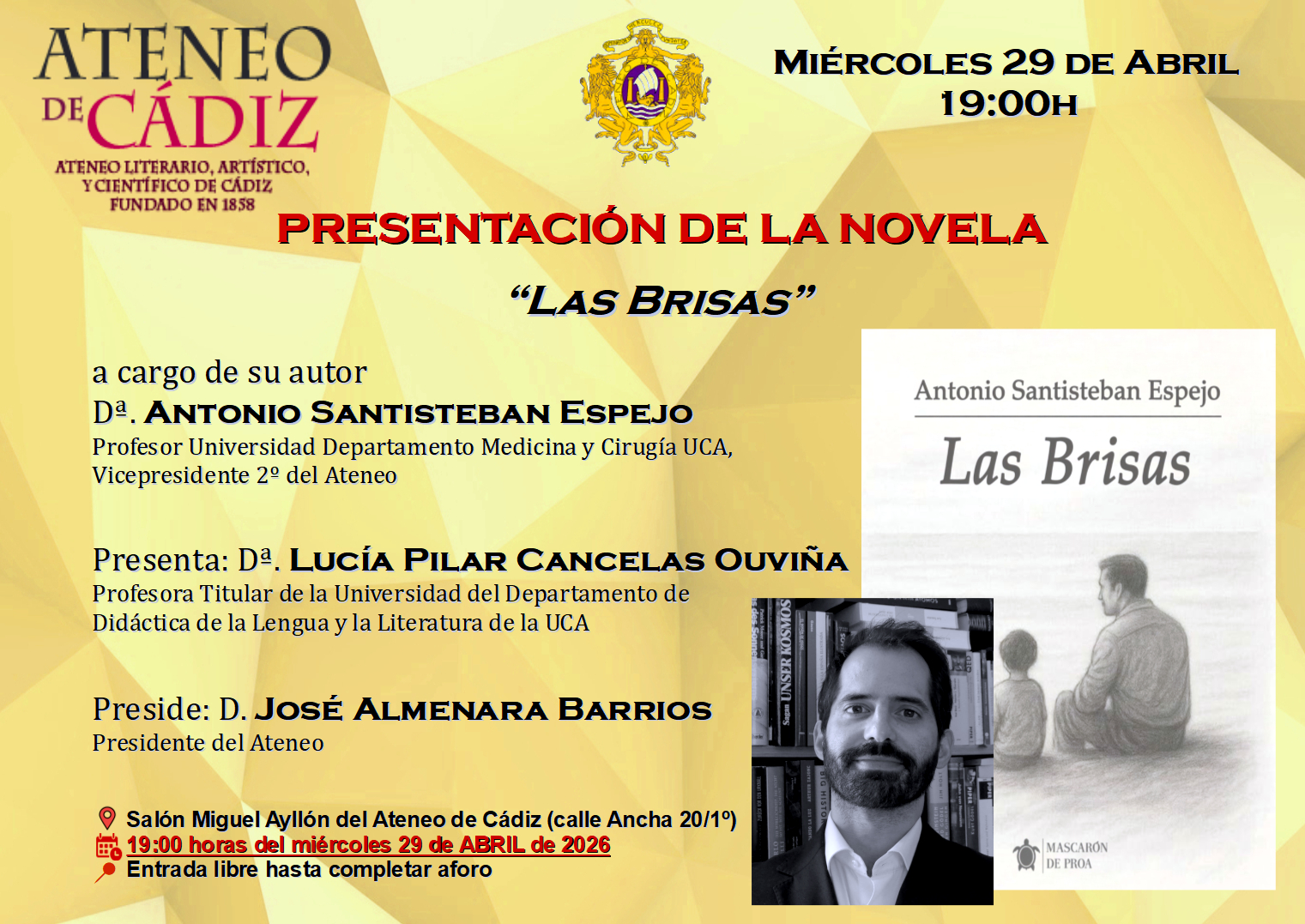 La presentación de la novela *Las Brisas* en Cádiz se celebrará, por tanto, este miércoles 29 de abril a las 19:00 horas en la sede del Ateneo, en la calle Ancha, en un acto público que reunirá a representantes del ámbito académico y cultural de la ciudad.