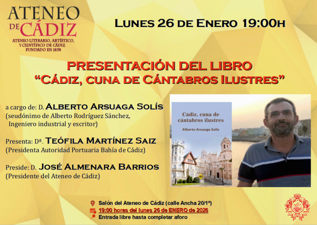 El Ateneo de Cádiz celebrará el próximo lunes 26 de enero a las 19:00 horas la presentación del libro Cádiz, cuna de cántabros ilustres, del escritor e ingeniero industrial Alberto Arsuaga Solís —seudónimo literario de Alberto Rodríguez Sánchez—. El acto tendrá lugar en el salón de la entidad, ubicado en la calle Ancha, y contará con entrada libre hasta completar aforo.