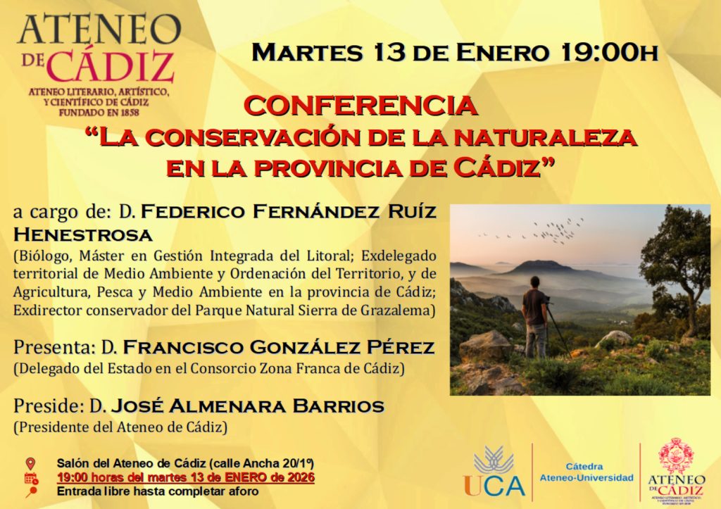 El Ateneo de Cádiz celebrará el próximo martes 13 de enero una conferencia titulada “La conservación de la naturaleza en la provincia de Cádiz”, que se enmarca en el programa de actividades culturales impulsadas por la institución junto a la Cátedra Ateneo–Universidad. El encuentro comenzará a las 19:00 en el Salón del Ateneo, ubicado en la céntrica calle Ancha, y contará con acceso libre hasta completar aforo.