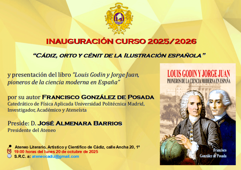 La inauguración incluirá también la presentación del libro “Louis Godin y Jorge Juan, pioneros de la ciencia moderna en España”, que será impartida por Rafael Francisco González de Posada, catedrático de Física Aplicada de la Universidad Politécnica de Madrid, investigador y académico miembro del Ateneo. La conferencia abordará la relevancia histórica de Cádiz como centro del pensamiento ilustrado en España, destacando el impacto de figuras científicas como Godin y Jorge Juan.