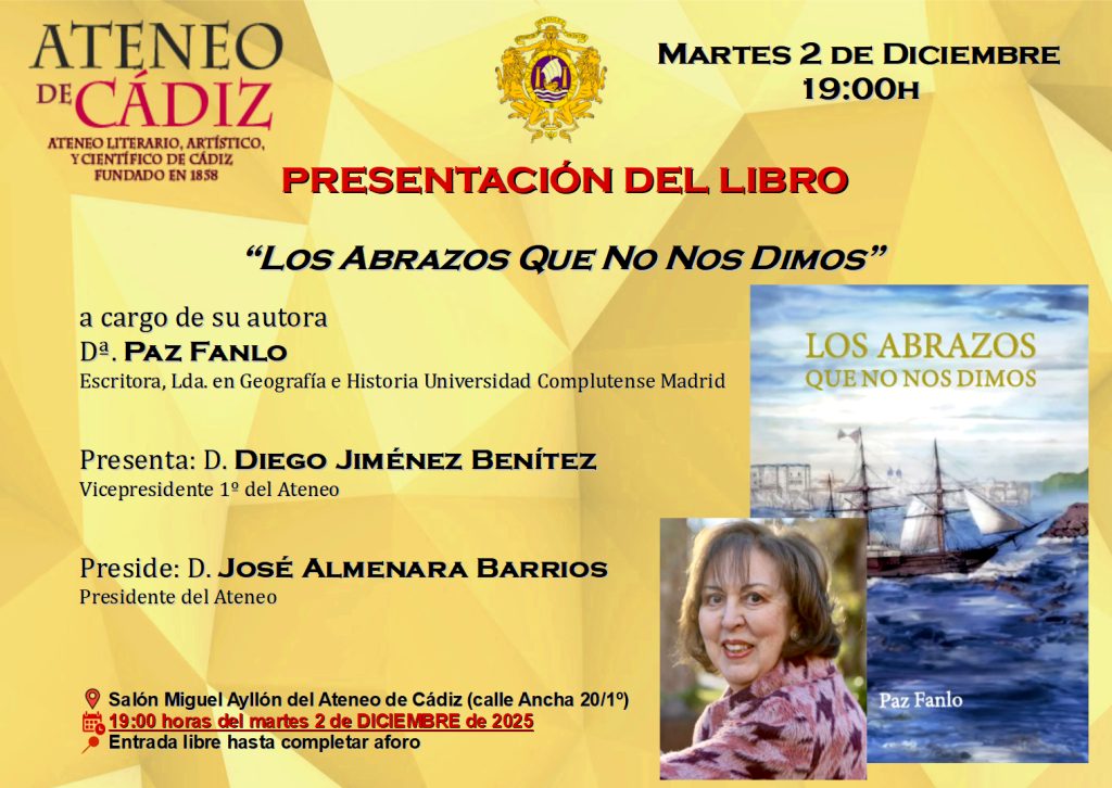 El Ateneo Literario, Artístico y Científico de Cádiz celebra este martes 2 de diciembre la presentación del libro “Los abrazos que no nos dimos”, obra de la escritora Paz Fanlo. El acto comenzará a las 19:00 horas en el Salón Miguel Ayllón, ubicado en la sede del Ateneo en la calle Ancha, número 20, y estará abierto al público hasta completar aforo. La actividad se enmarca en la programación cultural desarrollada por la institución para la difusión del pensamiento y la creación literaria en la ciudad.