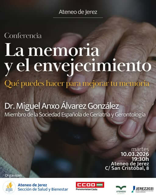 La conferencia sobre la memoria y el envejecimiento en Jerez estará a cargo del doctor Miguel Ángel Anxo Álvarez González, miembro de la Sociedad Española de Geriatría y Gerontología y especialista en envejecimiento activo. El acto está organizado por la sección de Salud y Bienestar del Ateneo y cuenta con la colaboración de CCOO Pensionistas de Cádiz.