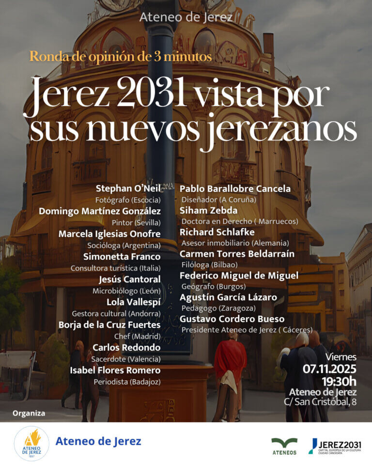 El Ateneo de Jerez celebrará este viernes 7 de noviembre, a las 19:30 horas, una ronda de opinión sobre la capitalidad europea de la cultura 2031, protagonizada por 16 nuevos jerezanos que aportarán su visión sobre las fortalezas y debilidades de la candidatura. El acto, de entrada libre hasta completar aforo, tendrá lugar en la sede del Ateneo, en la calle San Cristóbal número 8, y concluirá con un Jerez de honor para los asistentes.