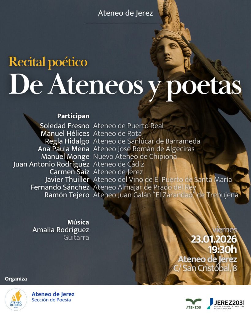 El Ateneo de Jerez celebrará este viernes 23 de enero el recital poético “De Ateneos y Poetas”, un acto que reunirá a representantes de diez ateneos de la provincia de Cádiz. La actividad comenzará a las 19.30 horas en la sede de la entidad, ubicada en la calle San Cristóbal número 8, con entrada libre hasta completar aforo.