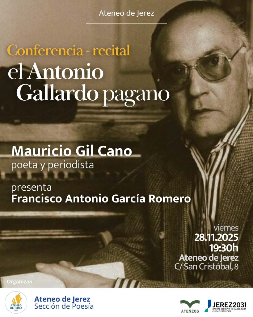 El Ateneo de Jerez celebrará este viernes 28 de noviembre, a las 19:30 horas, la conferencia poética titulada El Antonio Gallardo pagano, dirigida por el poeta y periodista Mauricio Gil Cano. El acto, organizado por la Sección de Poesía del Ateneo, forma parte del conjunto de actividades conmemorativas que durante este año recuerdan el centenario del nacimiento de Antonio Gallardo. Con esta convocatoria, la institución se suma al homenaje cultural que la ciudad dedica al artista jerezano a través de distintos eventos literarios y musicales.