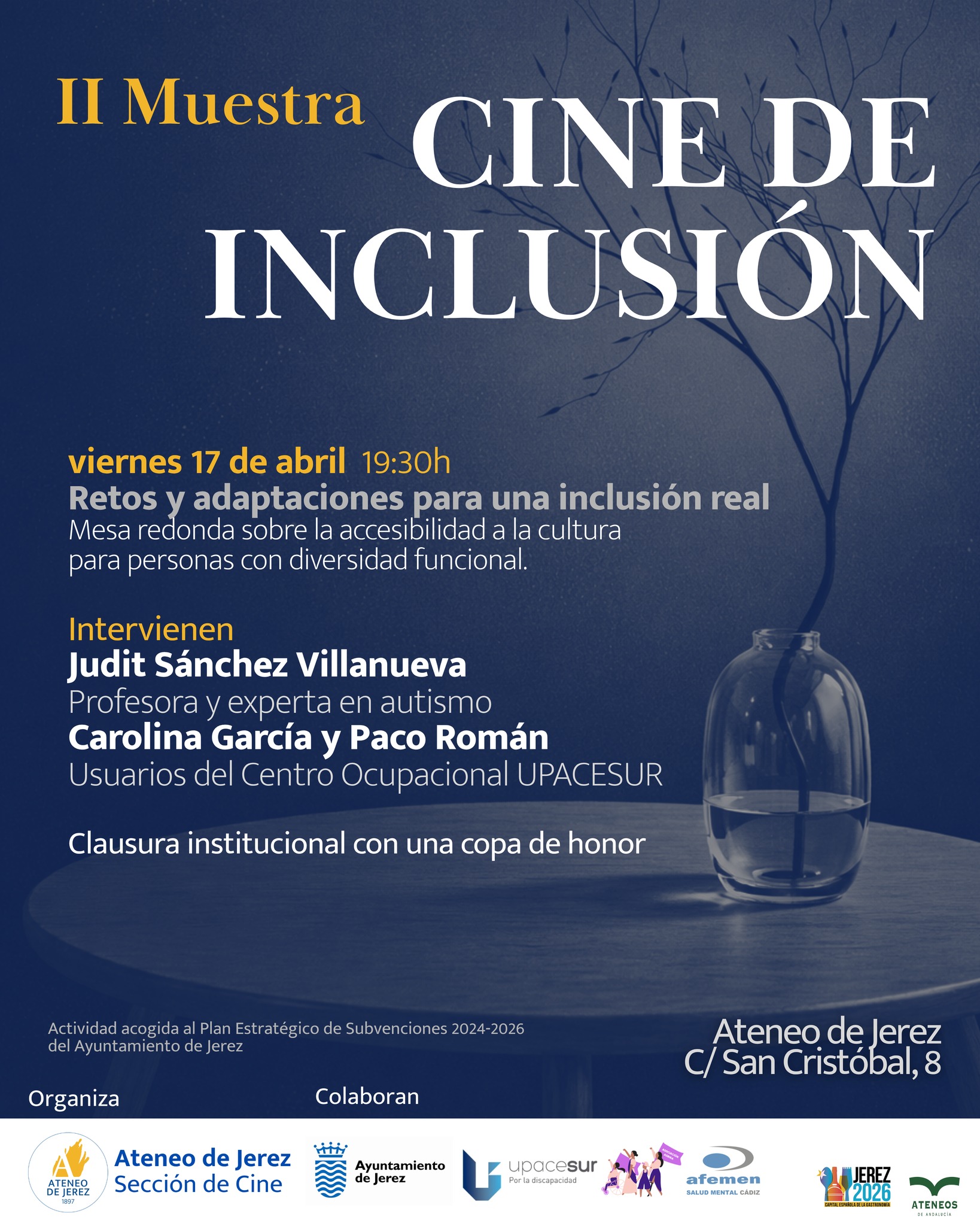 La actividad, titulada “Retos y adaptaciones para una inclusión real”, clausura la II Muestra de Cine de Inclusión organizada por la Sección de Cine del Ateneo. El ciclo se enmarca en el plan estratégico de subvenciones 2024-2026 del Ayuntamiento de Jerez y ha contado con la colaboración de las asociaciones UPACE (Unión de Parálisis Cerebral), AFEMEN (Asociación de Familiares de Enfermos Mentales) y el propio Consistorio.
