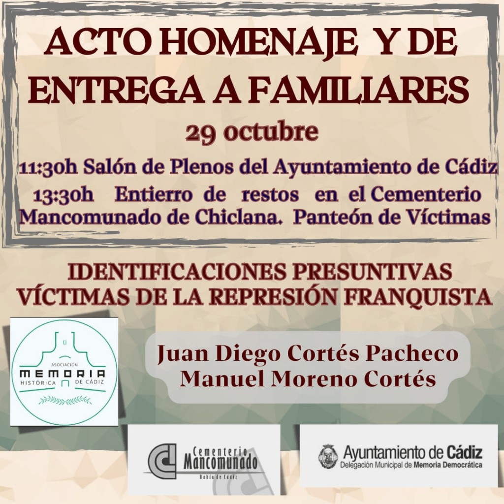 El Ayuntamiento de Cádiz acogerá el próximo miércoles 29 de octubre, a las 11:30 horas, el acto de entrega a sus familiares de los restos identificados de Juan Diego Cortés Pacheco y Manuel Moreno Cortés, ambos asesinados en los meses posteriores al golpe de Estado de julio de 1936.