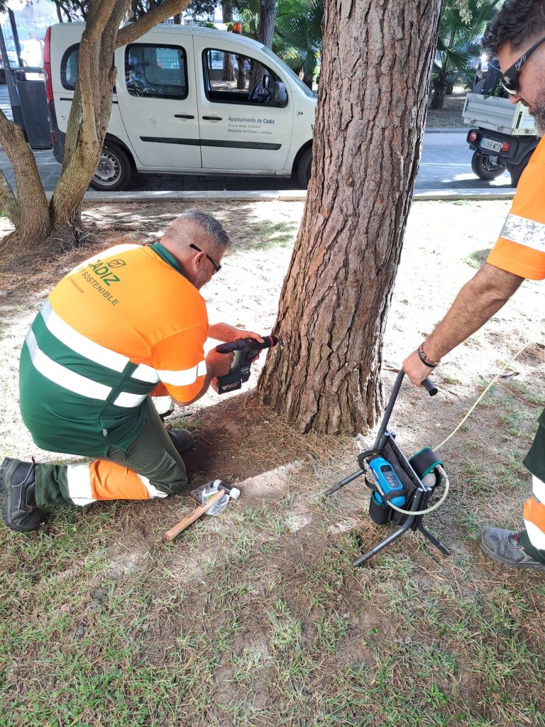 La delegación municipal de Parques y Jardines del Ayuntamiento de Cádiz ha comenzado esta semana la aplicación de tratamientos de endoterapia en los pinos de la ciudad para frenar la propagación de la oruga procesionaria, una plaga que afecta tanto a los árboles como a la salud de personas y animales.