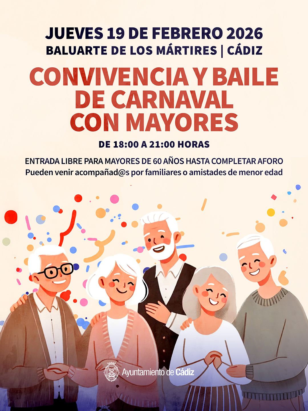El Ayuntamiento de Cádiz celebrará el próximo jueves 19 de febrero una jornada especial de Carnaval dirigida a la población mayor de la ciudad. El evento, denominado Carnaval con mayores en Cádiz, tendrá lugar en el Baluarte de los Mártires a partir de las 18.00 horas y contará con entrada gratuita hasta completar aforo.