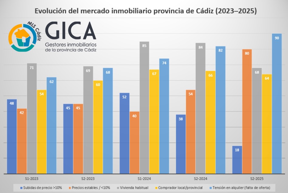 El Barómetro Inmobiliario de la Asociación de Gestores Inmobiliarios de la provincia de Cádiz (GICA), correspondiente al segundo semestre de 2025, apunta a un mercado de compraventa de vivienda estable y resistente al contexto económico, aunque con desequilibrios importantes que condicionarán la evolución del sector en 2026. El estudio se elabora a partir de las respuestas de más de cien agencias inmobiliarias asociadas y permite comparar por primera vez una serie completa desde la puesta en marcha del barómetro en 2023.
