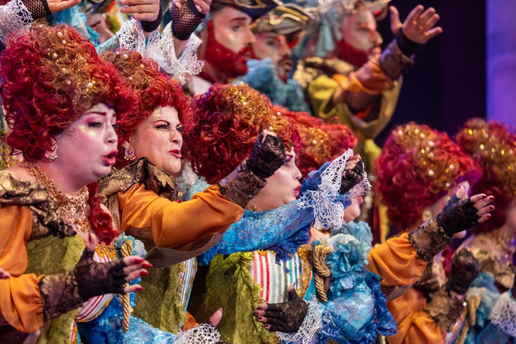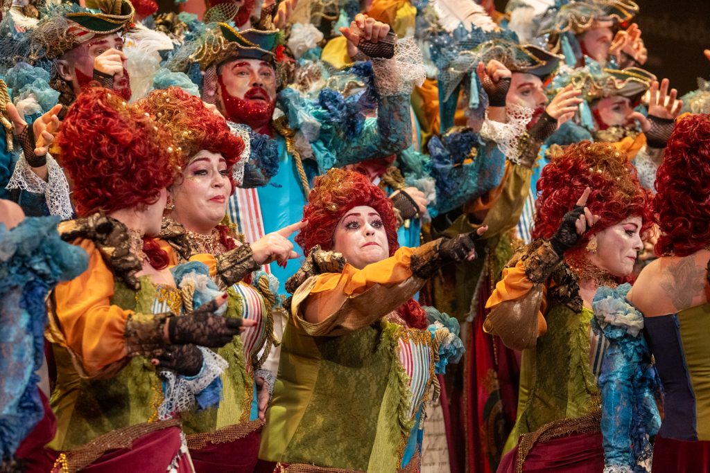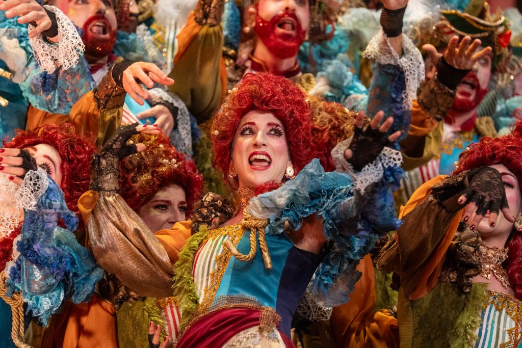 El telón se abrió entre penumbra y silencio, con el grupo apiñado en el proscenio hasta que una voz narradora introdujo el dispositivo dramático: una “fábrica de sueños” dedicada a recomponer el ADN gaditano. La presentación ensambló imágenes de piedra, murallas, mar, compás y resiliencia hasta enunciar la tesis del repertorio: Cádiz ha perdido parte de su esencia y es necesario recuperarla. Sin alardes escenográficos, el coro apostó por la solemnidad y por una estética que remitía a la genealogía histórica de la ciudad. Fue una presentación limpia, comprensible y eficaz.