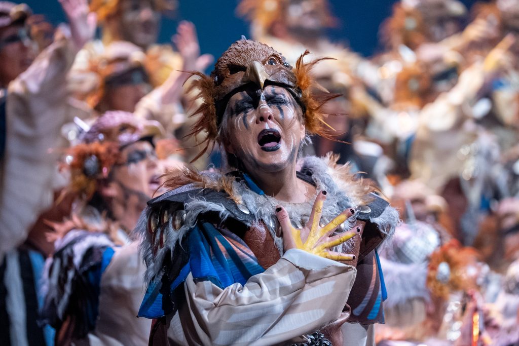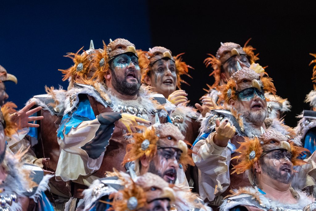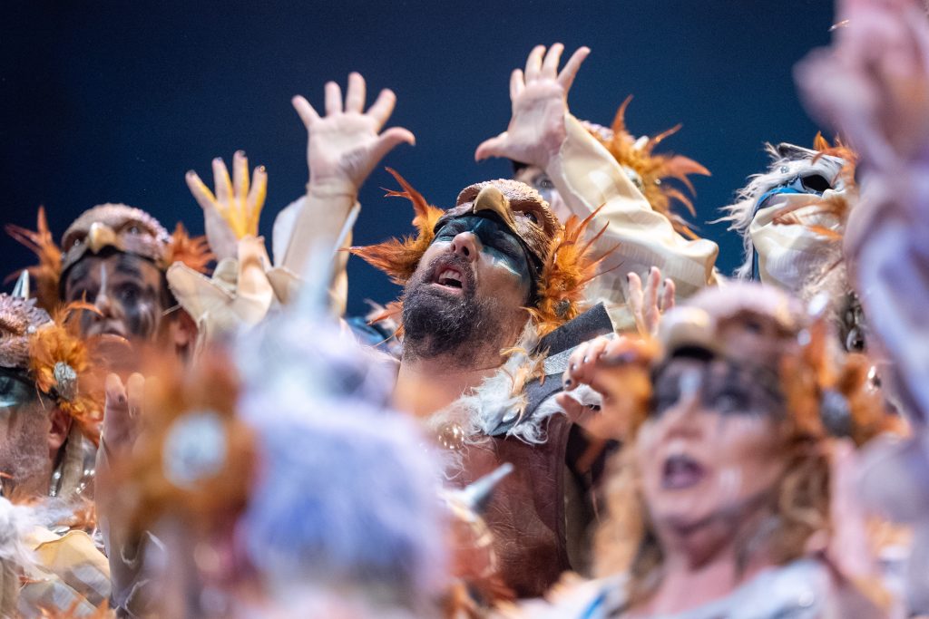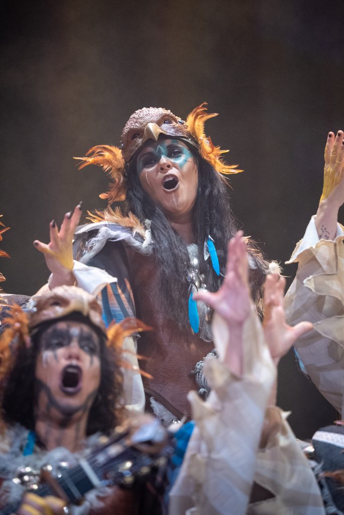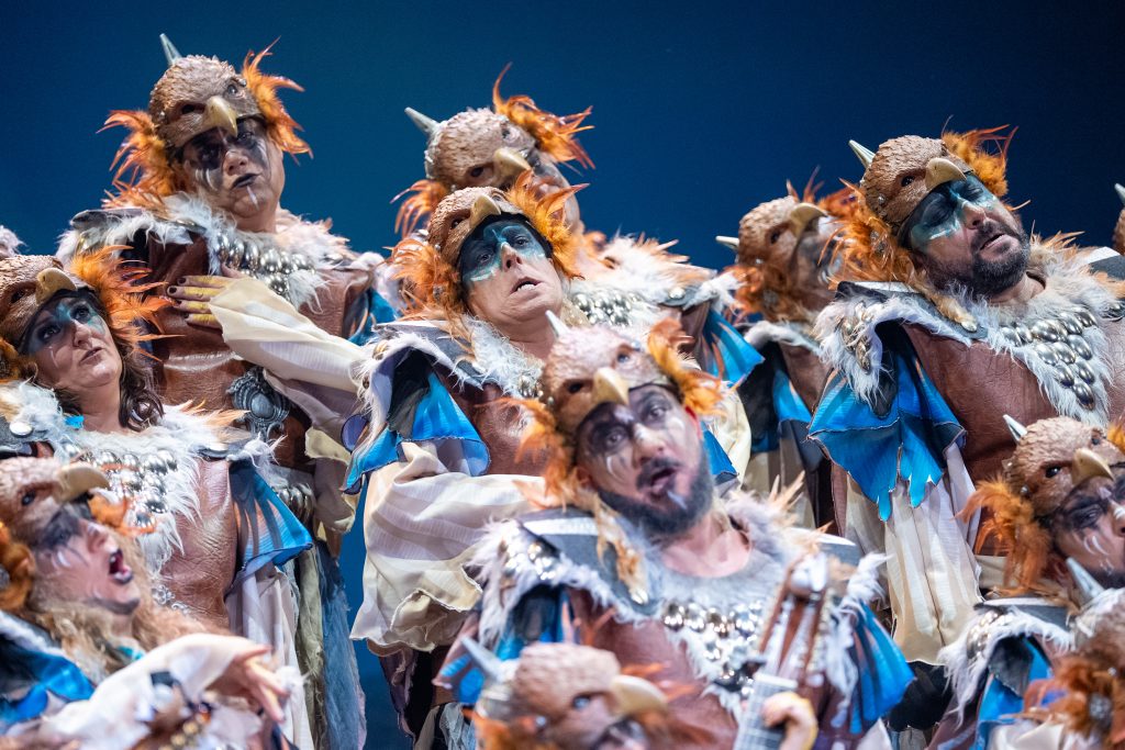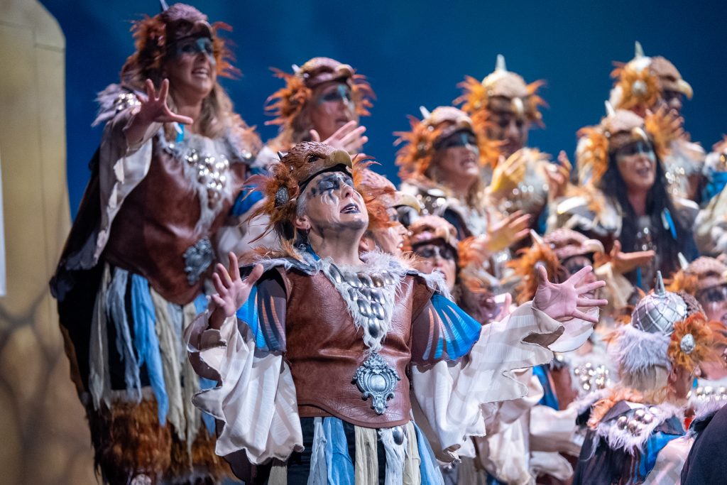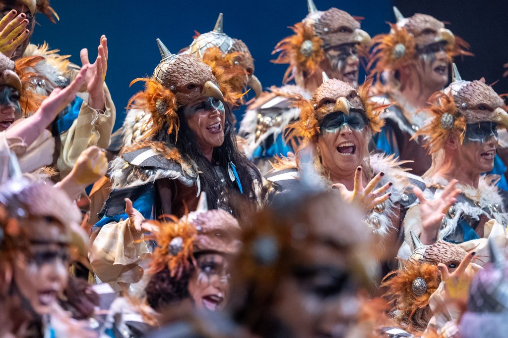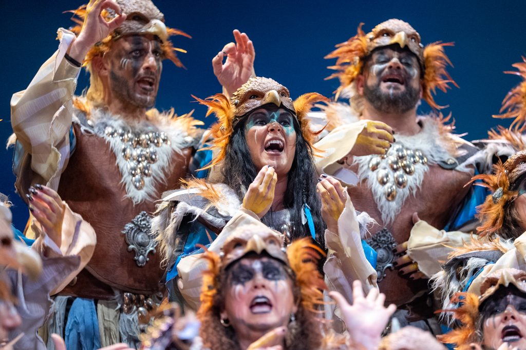 La propuesta escénica se sostiene sobre un tipo muy reconocible: águilas que vuelan simbólicamente desde La Isla hasta Cádiz. El concepto, de carácter épico y visual, se entiende desde el primer momento y funciona como hilo conductor del repertorio. El coro apuesta por una estética cuidada y un mensaje de elevación, libertad y resistencia, apoyándose más en la fuerza musical que en la profundidad literaria.