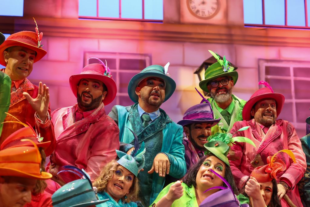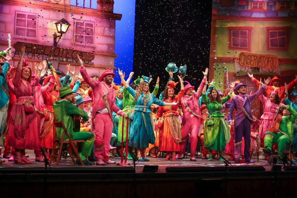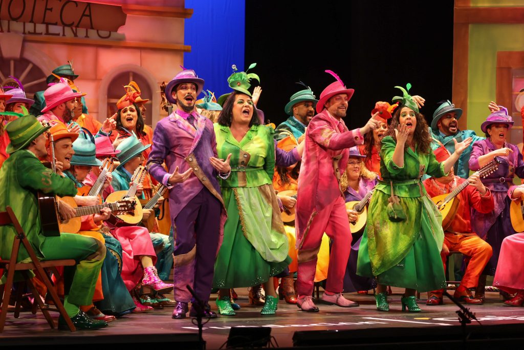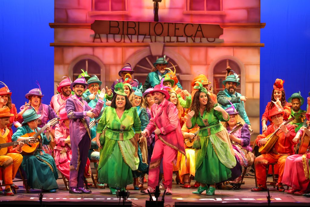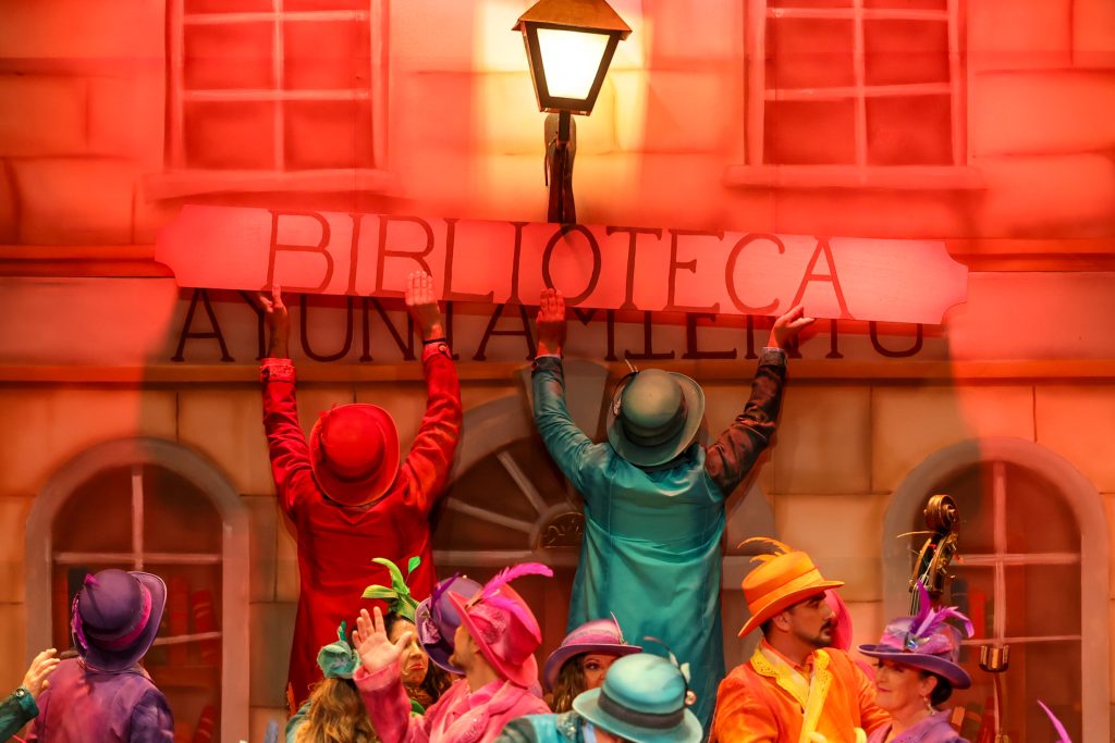 El planteamiento del tipo fue claro desde el alzarse del telón. Sobre el escenario aparecía una ciudad idealizada: banco convertido en conservatorio, ayuntamiento sustituido por biblioteca, escuela pública por delante de la privada. No había dinero, ni gobernantes, ni desigualdad. La presentación funcionó visualmente, con un punto infantil y vitalista, y asentó la idea matriz: una ciudad sin jerarquías en la que “todos y todas son iguales”. El coro cantó con buena presencia escénica, conjunción vocal y afinación ordenada, confirmando que el grupo conserva el perfil técnico que dejó en la edición anterior.