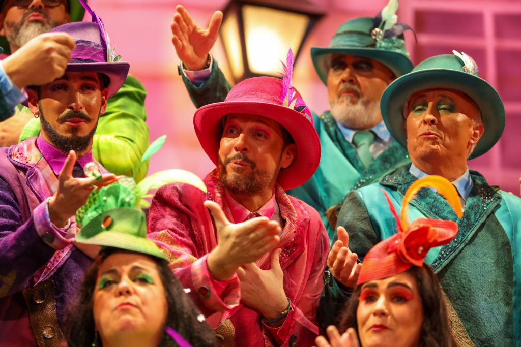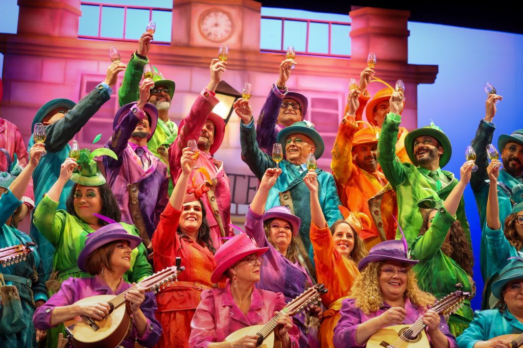 El popurrí cerró el pase con mayor ambición escénica. Musicalmente recordó a códigos más próximos al musical —Broadway, West Side Story o incluso Mary Poppins en pasajes concretos— con amplio juego coral, dinámica y progresión dramática. El bloque retomó la utopía inicial para llevarla al conflicto: la llegada del gobernante, el dinero como elemento corruptor, la desigualdad, la guerra y la pérdida de la propia ciudad idealizada. El giro dramatúrgico funcionó y el mensaje quedó claro: la utopía es viable mientras no intervienen poder y mercado. El cierre fue amable y dejó una lectura simbólica: “la ciudad perfecta” existe cada febrero en Cádiz cuando llega el carnaval.