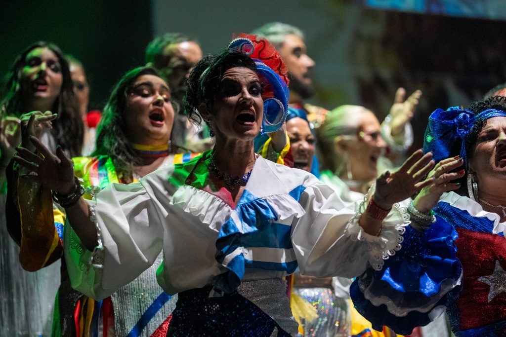La presentación activó la idea con claridad. El telón mostró color, baile y orquesta, apoyado en una lectura explícita del imaginario chileno. La declaración de principios no dejó dudas: el repertorio no buscaba la solemnidad coral tradicional sino la apertura del coro a la cultura del macrofestival. La entrada tuvo ritmo, escenografía y una energía poco habitual en el formato, lo que generó impacto en el público general del Falla. A partir de ahí se abrió el problema estructural que dominaría el resto del pase: el espectáculo absorbió a la copla.