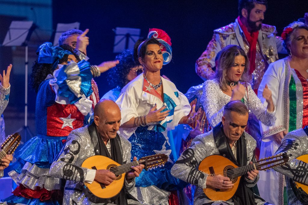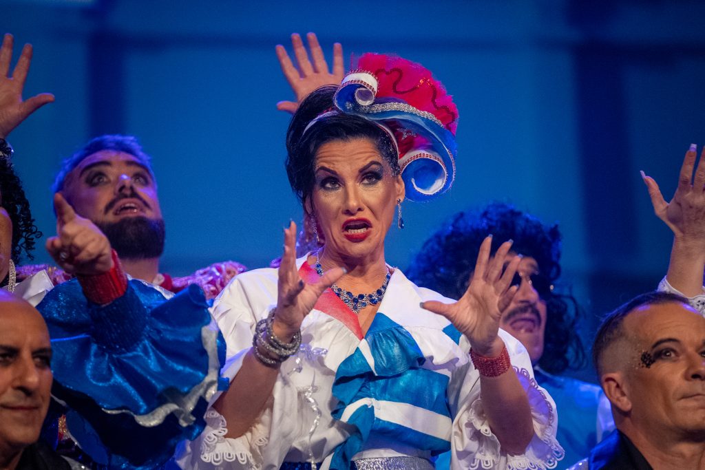 Las letras del tango tampoco encontraron un centro. La primera pieza abordó el debate del “apartado femenino” en los reconocimientos del Carnaval y la creación del antifaz específico para mujeres, con mención implícita a Adela del Moral. El enfoque reunió feminismo, ironía y crítica institucional, pero derivó en contradicción discursiva y careció de cierre sólido. La segunda letra trasladó el festival al terreno político: industria musical convertida en metáfora de la política nacional, con promotores, cachés, fraude, incompetencia técnica y un remate que parecía invitar a la abstención. La idea literaria era compleja pero poco legible en tiempo real y la metáfora exigía un decodificador que el público no tuvo.