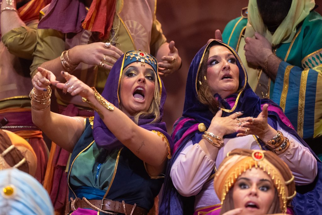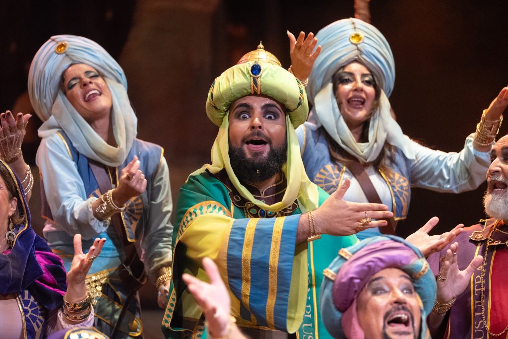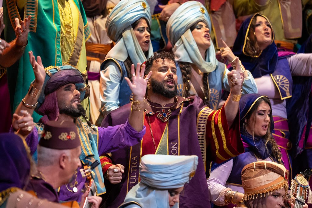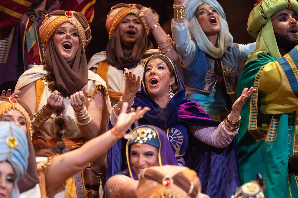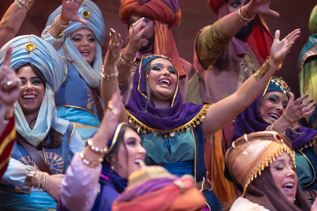 La presentación introduce con solvencia ese universo orientalizado, apoyada en una música de aire flamenco-oriental que envuelve bien la escena y permite un cambio visual respecto a la propuesta del pasado año, ‘El gallinero’. El arranque es elegante y bien ejecutado, con un sonido reconocible de la agrupación y una estética cuidada, aunque no logra un impacto inicial especialmente contundente. Funciona desde la corrección y la coherencia, más que desde la sorpresa.