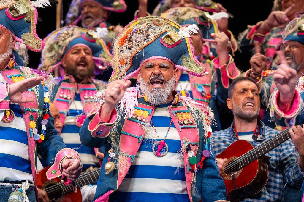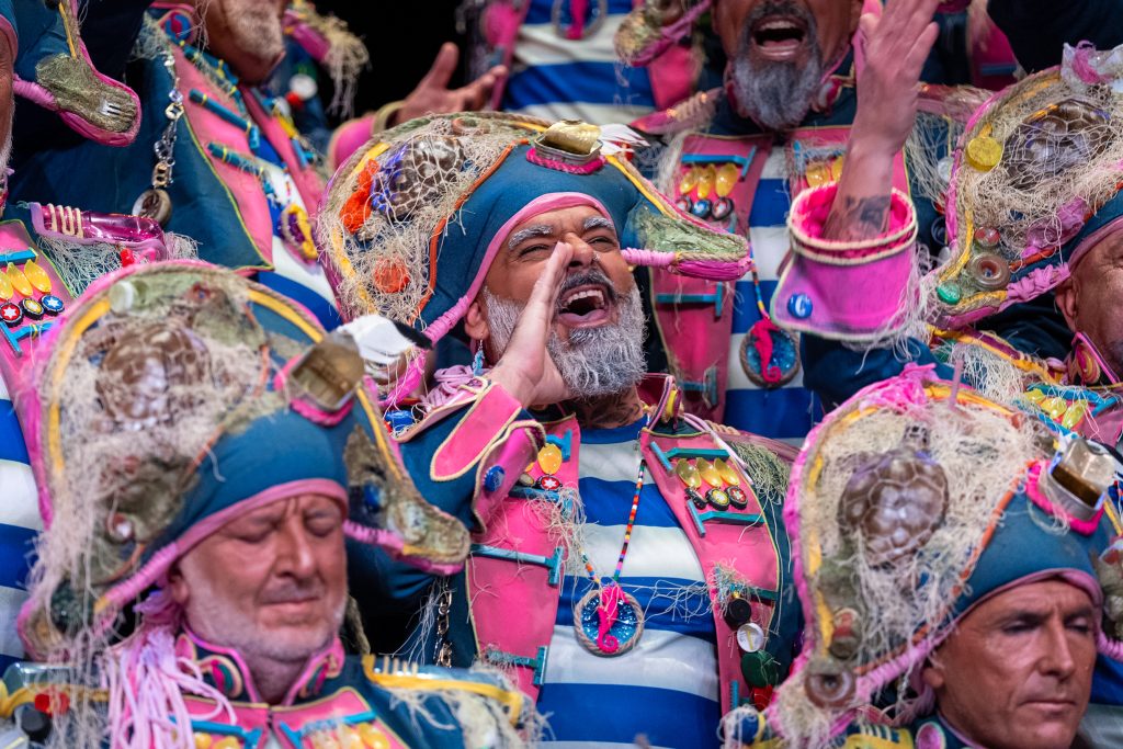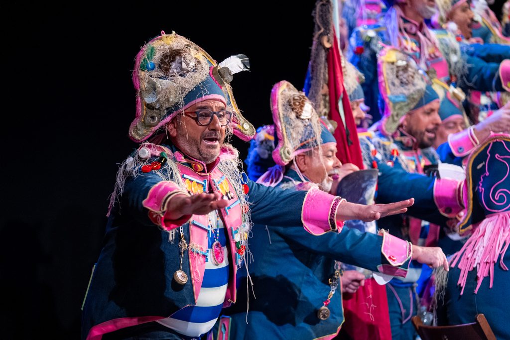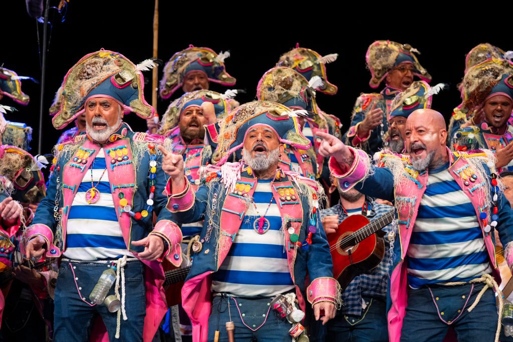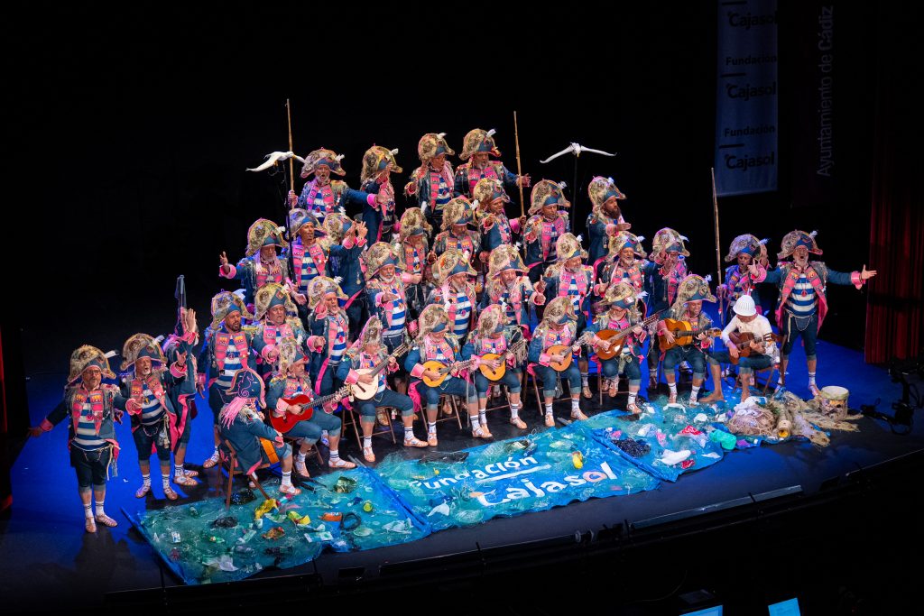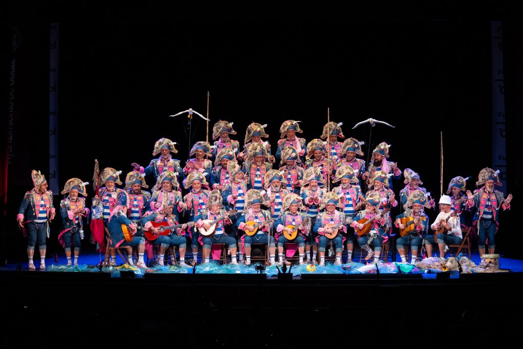 La escena inicial se construyó a partir de un diálogo de pescadores en los bloques del Campo del Sur, con referencias a las capturas y al “morralla” propio del oficio. La presentación dio pronto un giro hacia la denuncia ambiental. El coro dibujó una bahía saturada de residuos y apeló a la necesidad de “mentalizarse” para frenar la contaminación marina. La musicalidad arrancó con un aire cercano a comparsa antes de ensamblar el coro al completo, momento en el que el tipo se completó con estetización militar (sombreros napoleónicos) y un tono de “resistencia” frente al deterioro del planeta.