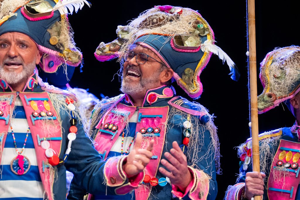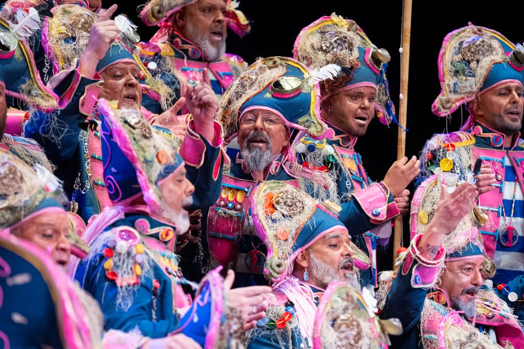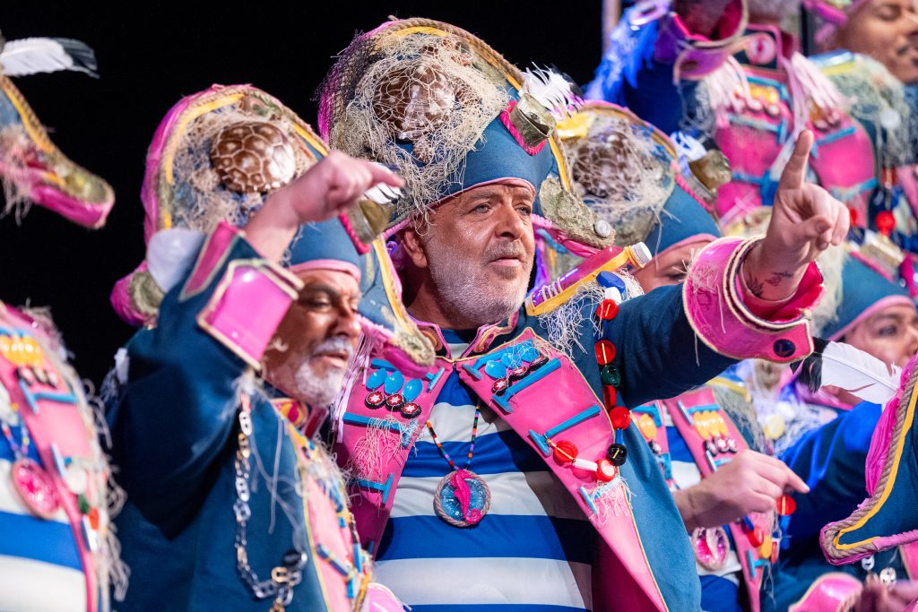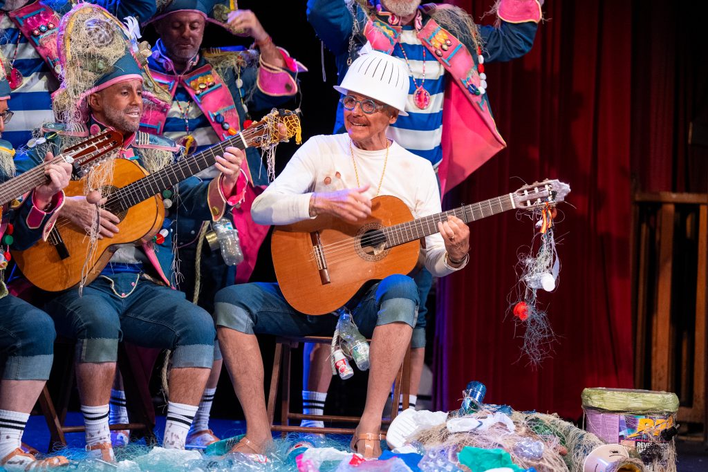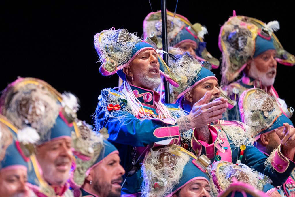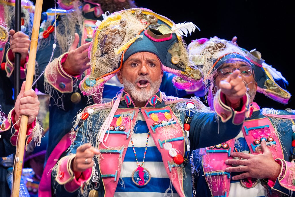 La escena inicial se construyó a partir de un diálogo de pescadores en los bloques del Campo del Sur, con referencias a las capturas y al “morralla” propio del oficio. La presentación dio pronto un giro hacia la denuncia ambiental. El coro dibujó una bahía saturada de residuos y apeló a la necesidad de “mentalizarse” para frenar la contaminación marina. La musicalidad arrancó con un aire cercano a comparsa antes de ensamblar el coro al completo, momento en el que el tipo se completó con estetización militar (sombreros napoleónicos) y un tono de “resistencia” frente al deterioro del planeta.