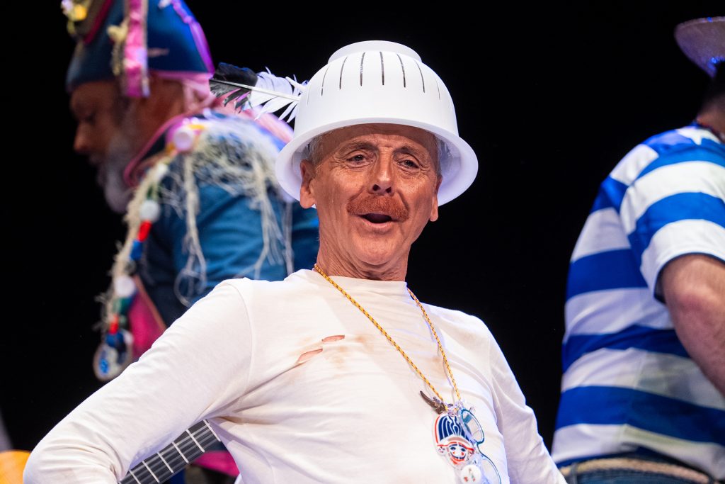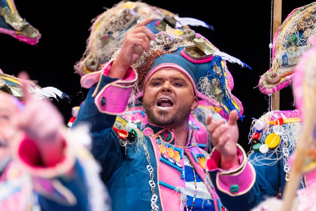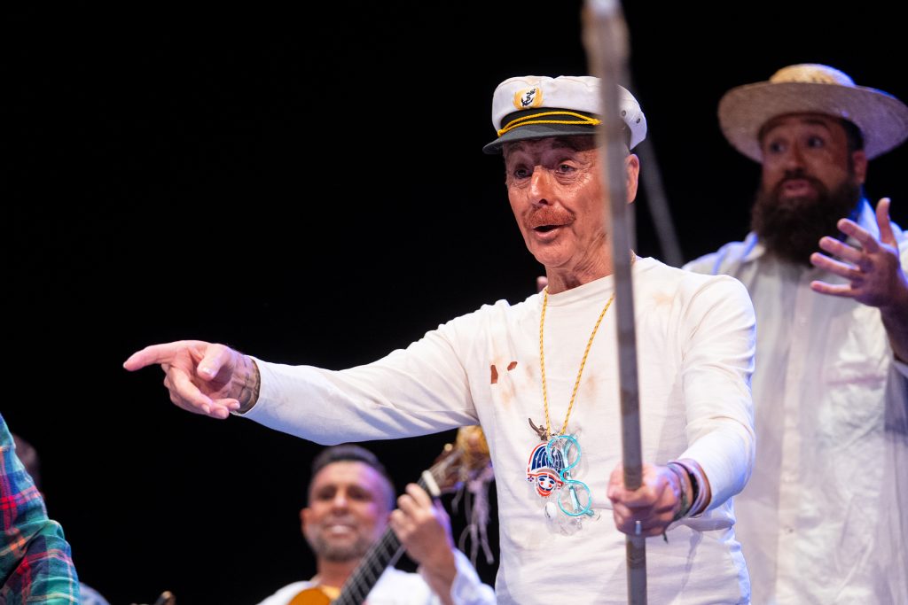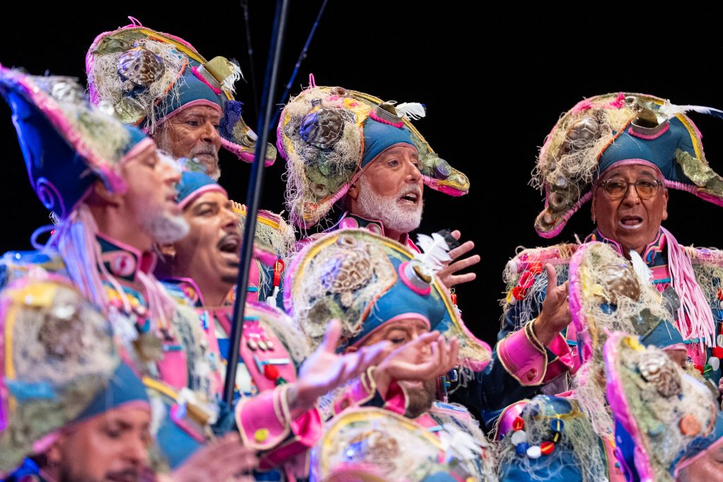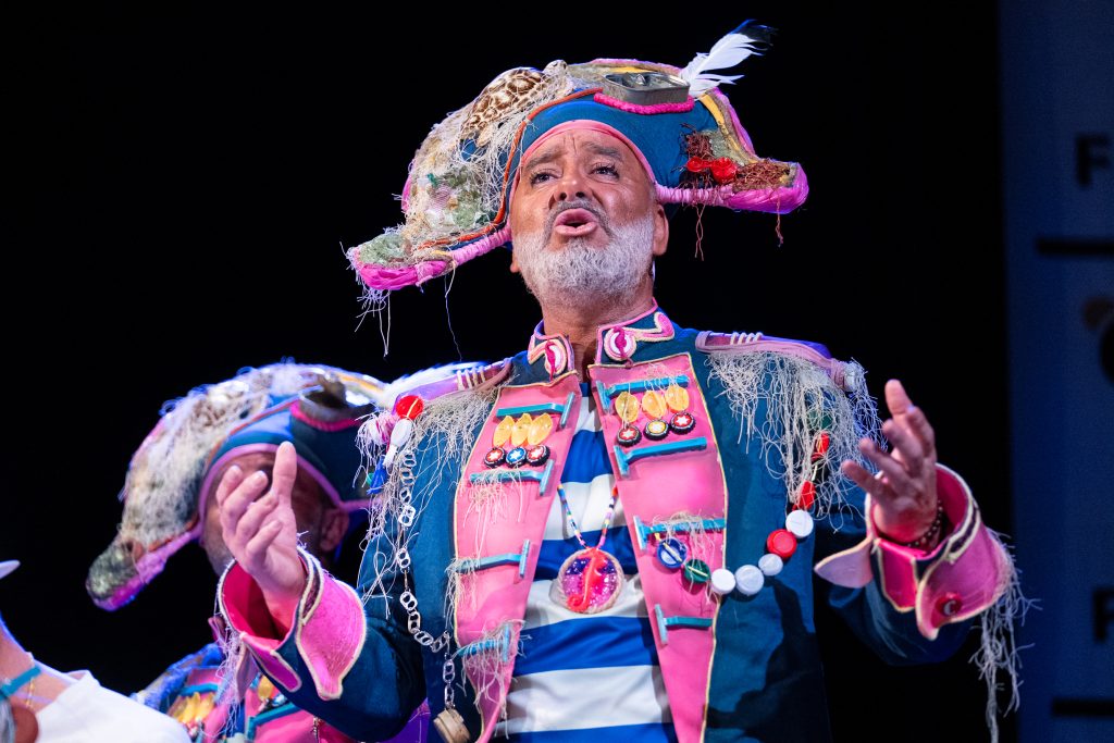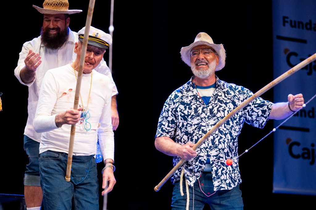 La escena inicial se construyó a partir de un diálogo de pescadores en los bloques del Campo del Sur, con referencias a las capturas y al “morralla” propio del oficio. La presentación dio pronto un giro hacia la denuncia ambiental. El coro dibujó una bahía saturada de residuos y apeló a la necesidad de “mentalizarse” para frenar la contaminación marina. La musicalidad arrancó con un aire cercano a comparsa antes de ensamblar el coro al completo, momento en el que el tipo se completó con estetización militar (sombreros napoleónicos) y un tono de “resistencia” frente al deterioro del planeta.